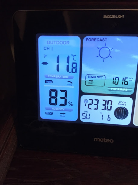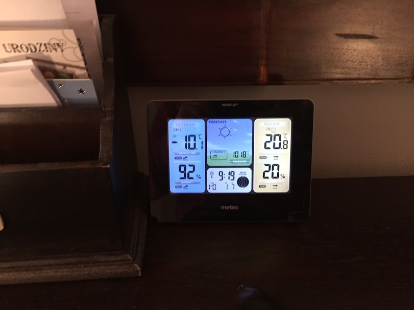 Wieczorem się do reszty rozpogodziło, co pozwoliło na pierwszy w 2019 roku większy spadek temperatury. U mnie jak widać już przed północą było prawie -12 stopni. Ciekawe ile miałem nad ranem? Tego niestety nigdy się nie dowiem. Ale skoro w Legionowie było minimalnie -13.5, to całkiem możliwe że na mojej wsi nawet do -15 dobiło...