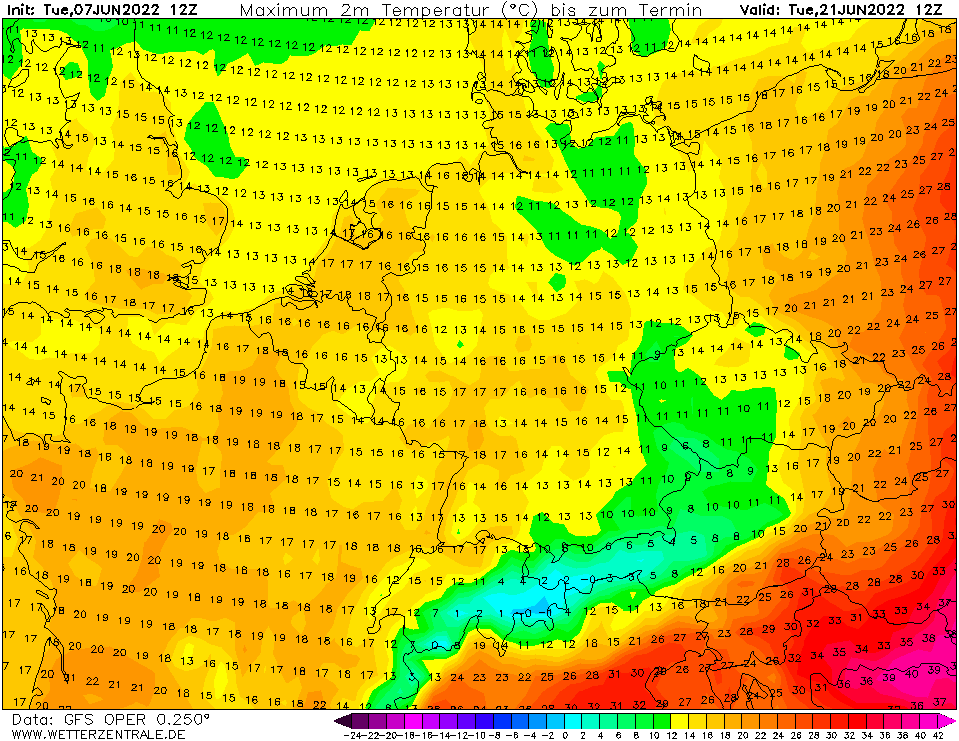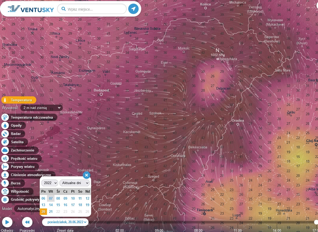 FKK - 7 Czerwiec 2022, 11:26 Ponad 40 stopni na Węgrzech i tuż na południe od Polski ma być 20 czerwca, zwróccie uwagę na tą plamkę z dużo niższą temperaturą xD
