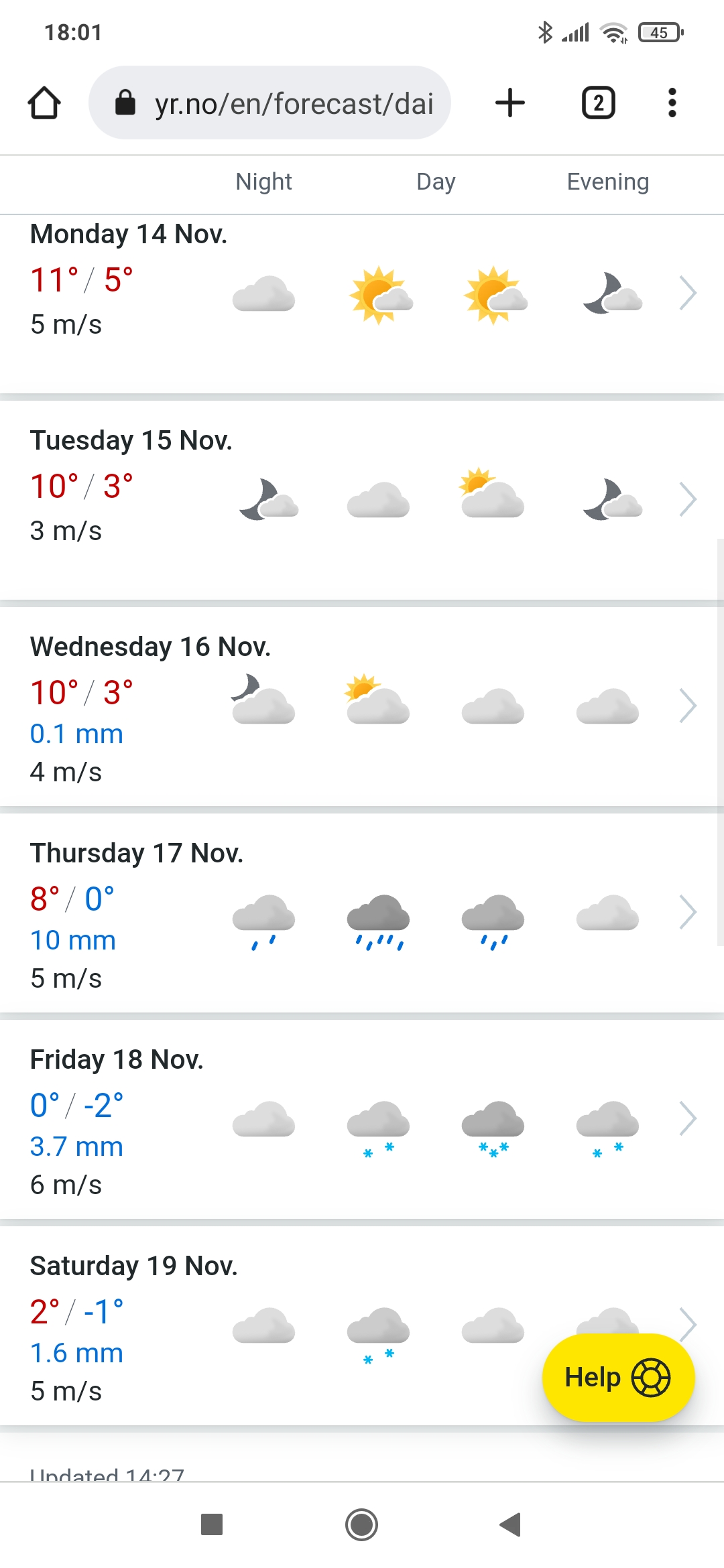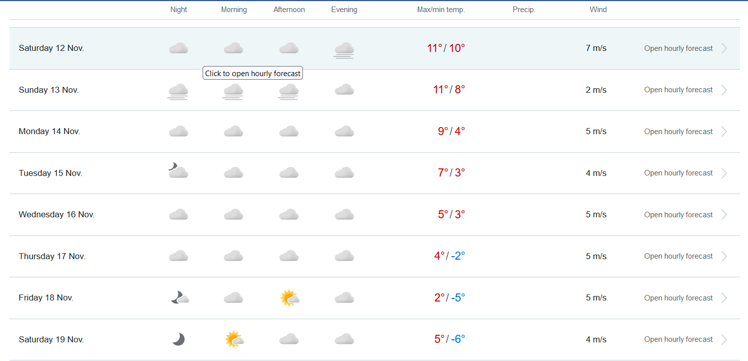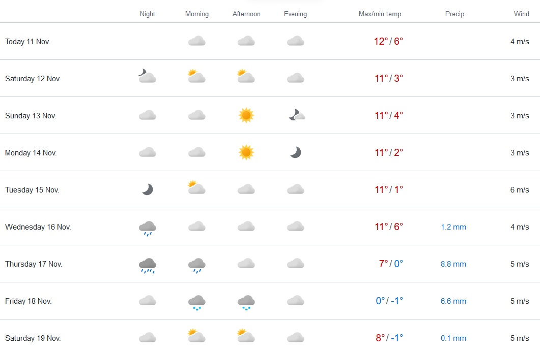 Co ciekawe, jak na razie taką temperaturę tylko yr.no prognozuje, bo meteologix.com (który także korzysta z ECMWF) prognozuje już +6 stopni.Janekl - 11 Listopad 2022, 13:38 A u mnie nie ma być opadów ale mróz w nocy jest.