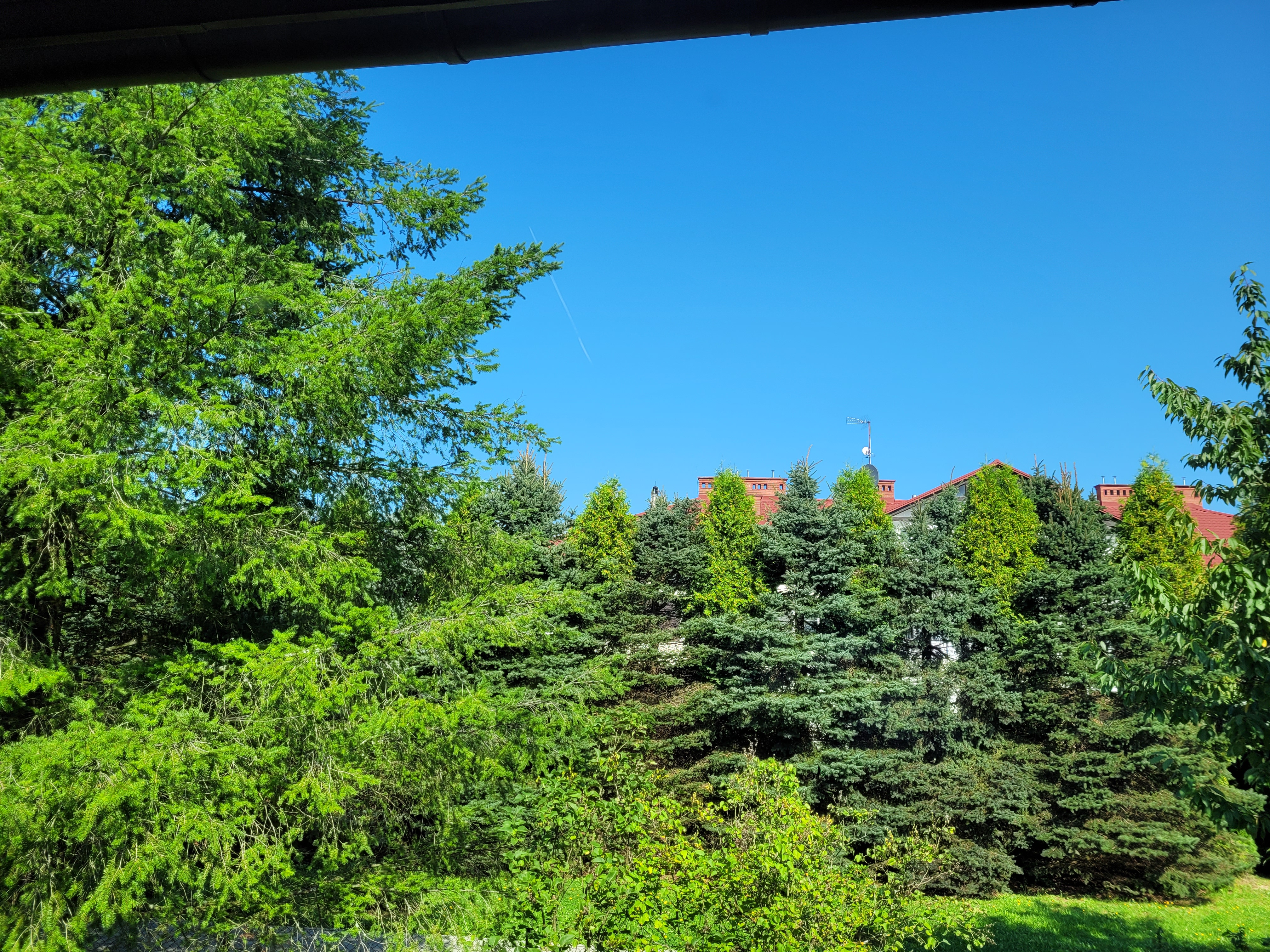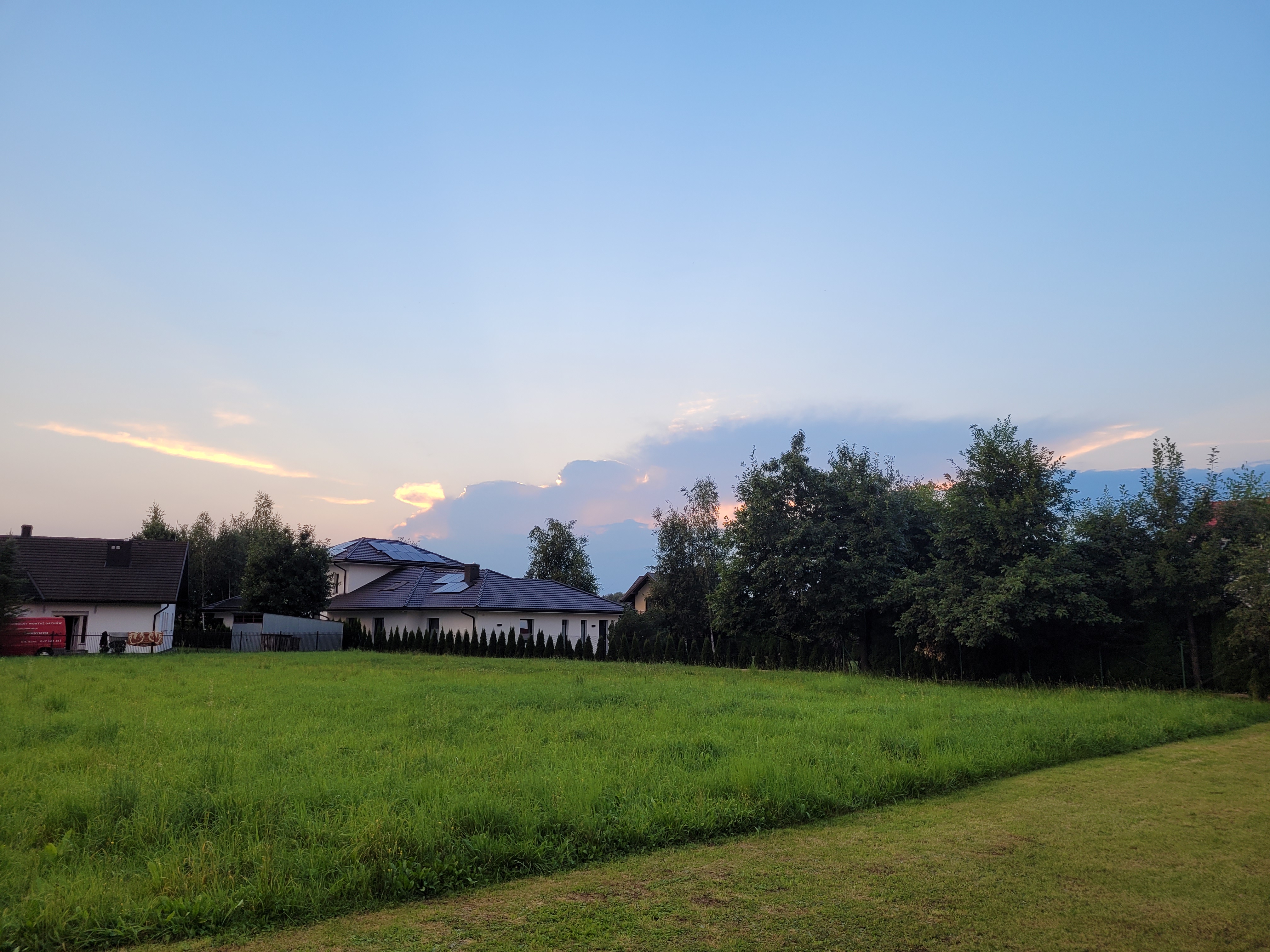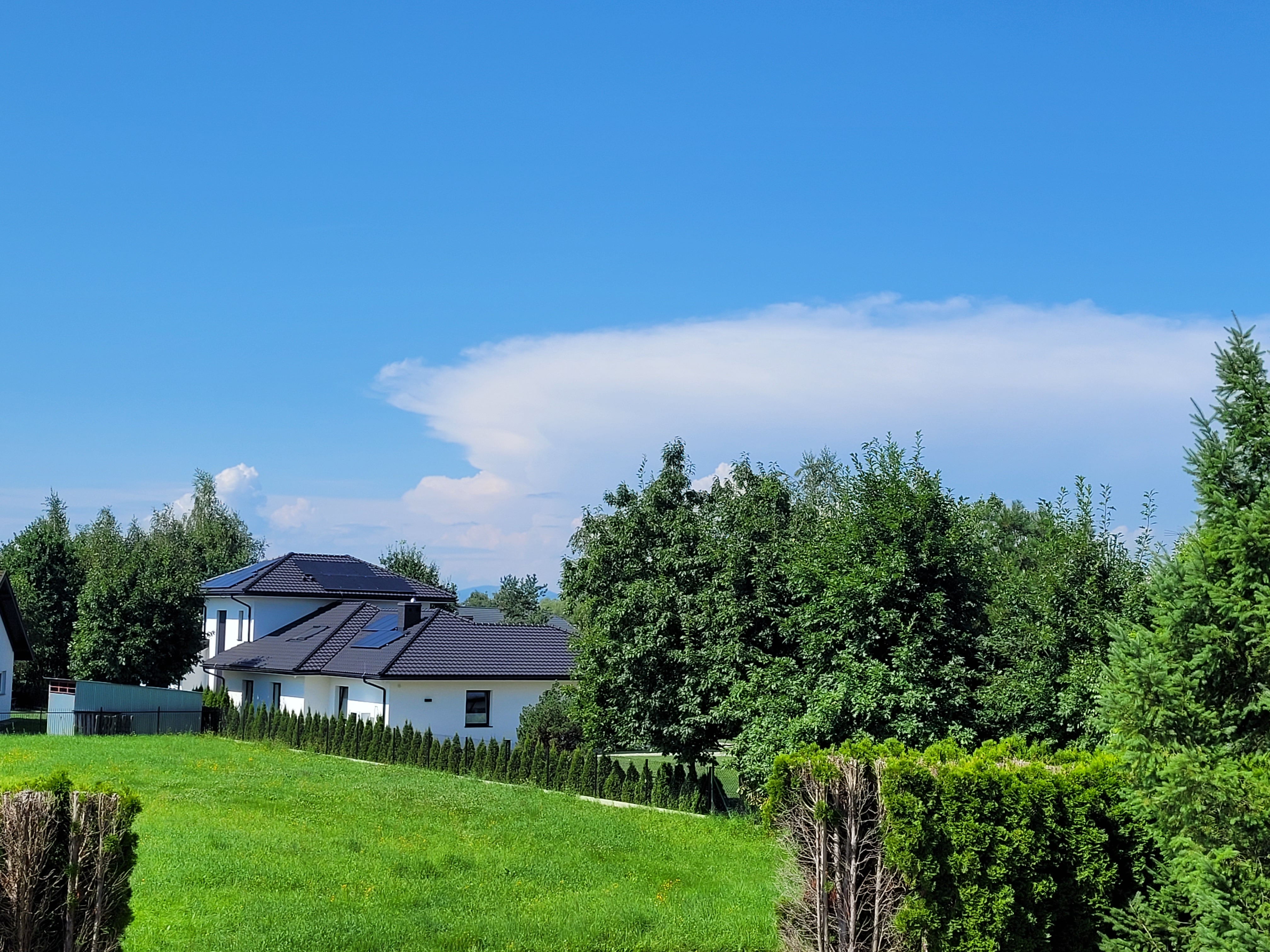 Trwał wyścig z czasem, bo należało dokończyć koszenie trawy i jeszcze zdążyć wywieźć do ulicy worki z trawą. Co chwilę jednak zerkałem w tamtą stronę, upatrując w burzy nadzieję na przerwanie upału. Temperatura rosła jak szalona. O 12:00 notowano 29,6, zaś o 13:00 - 31,6 stopnia. Dawało się to we znaki, ale mogłem przynajmniej opalić sobie plecy