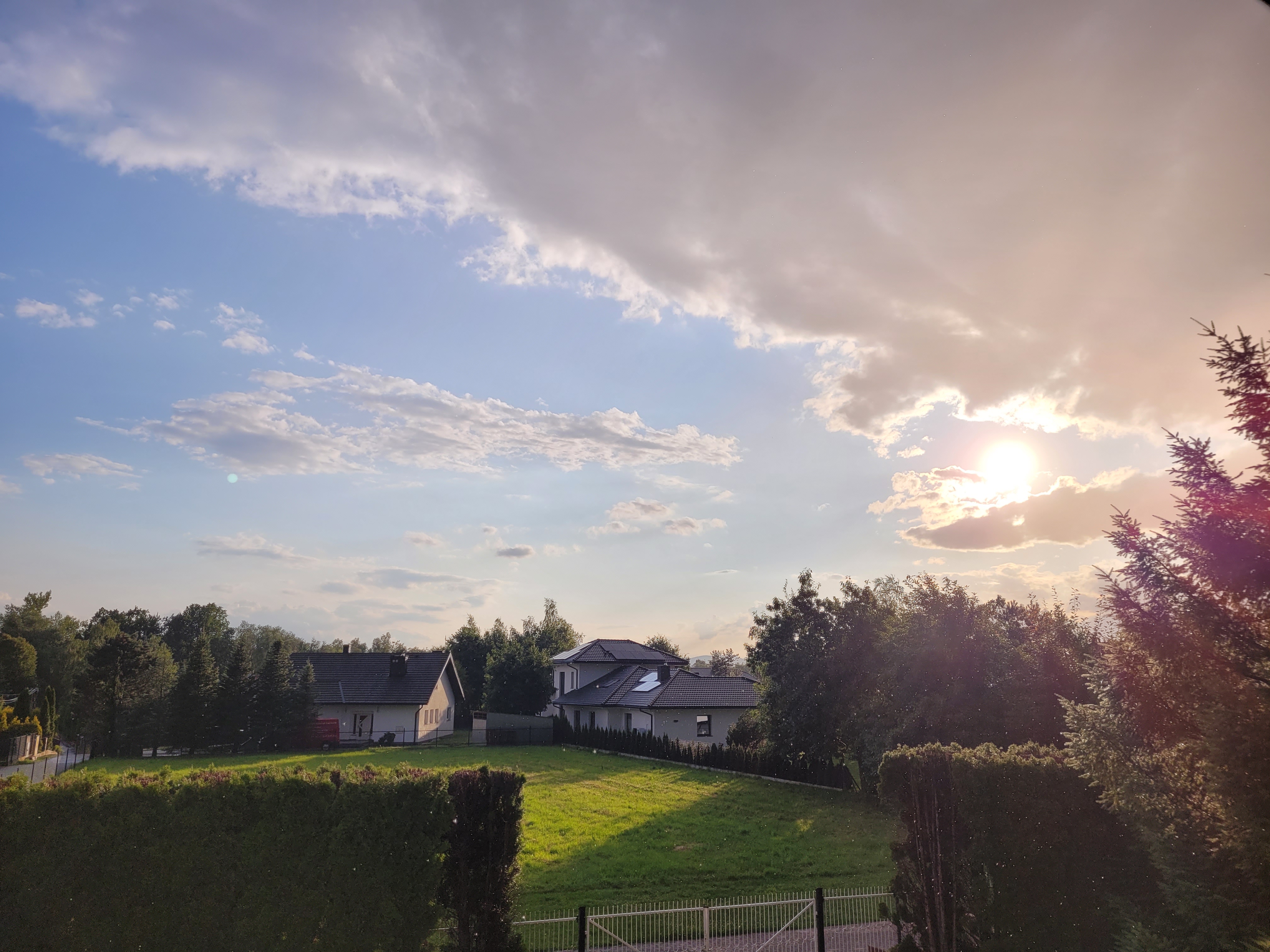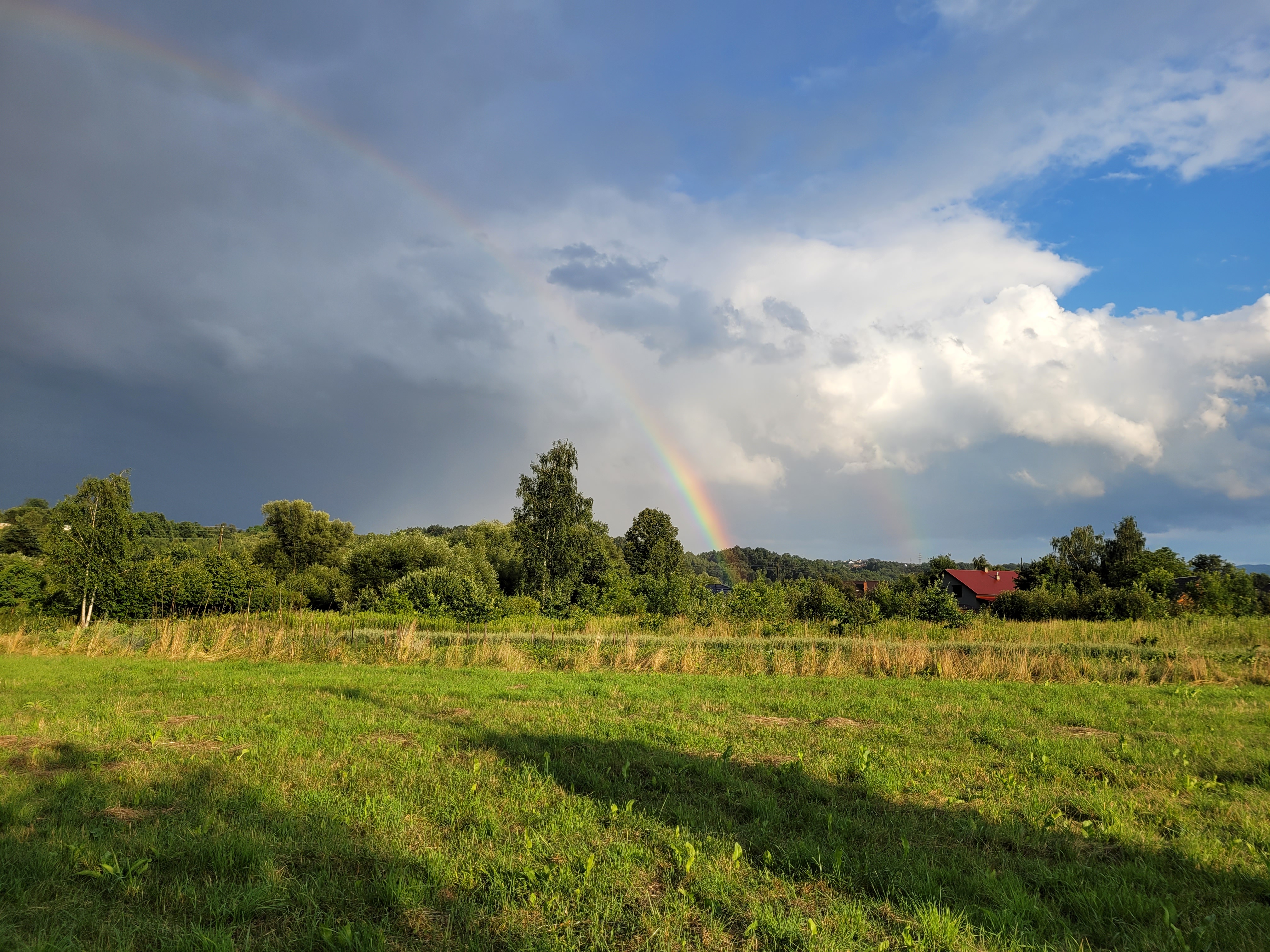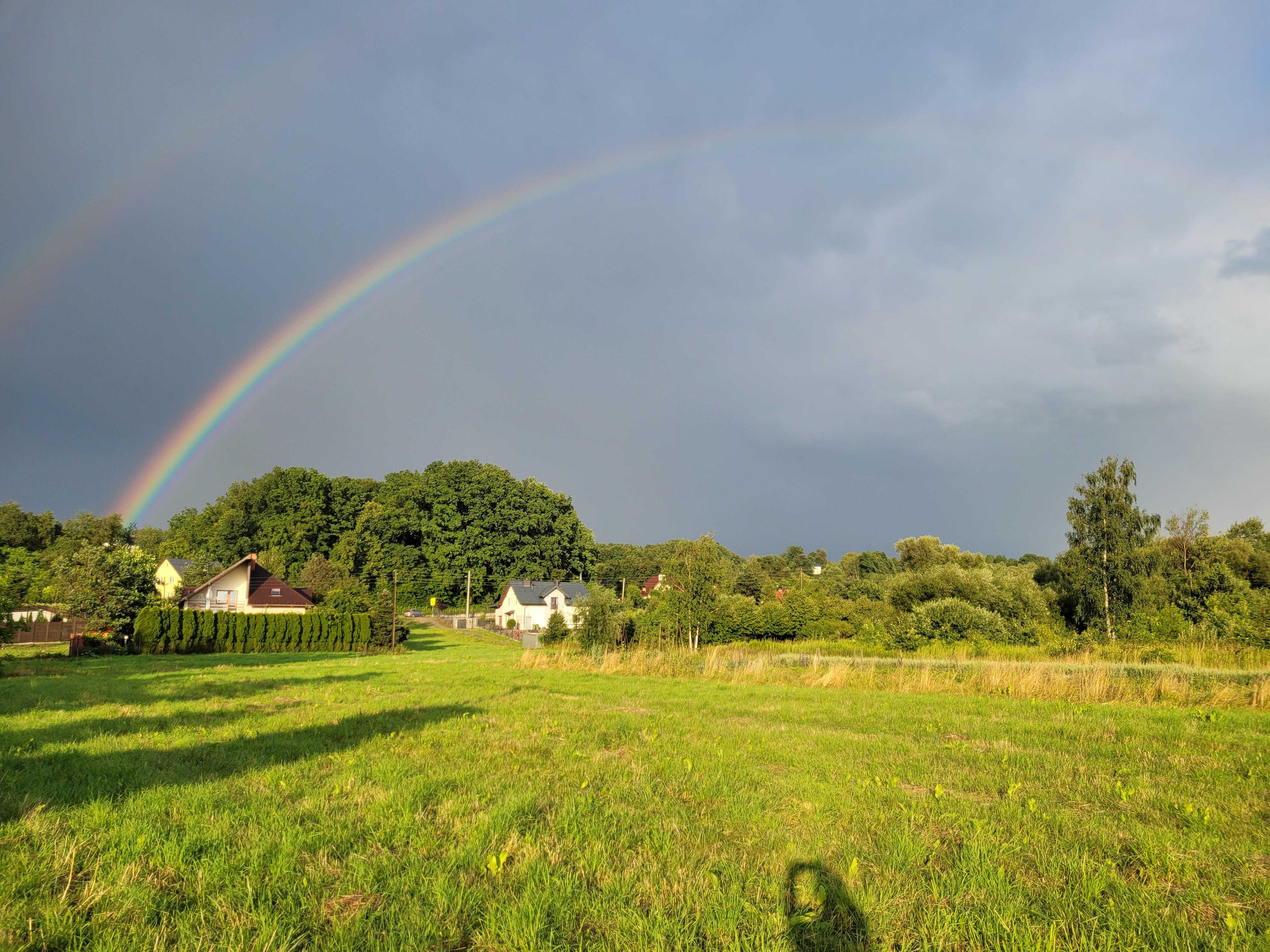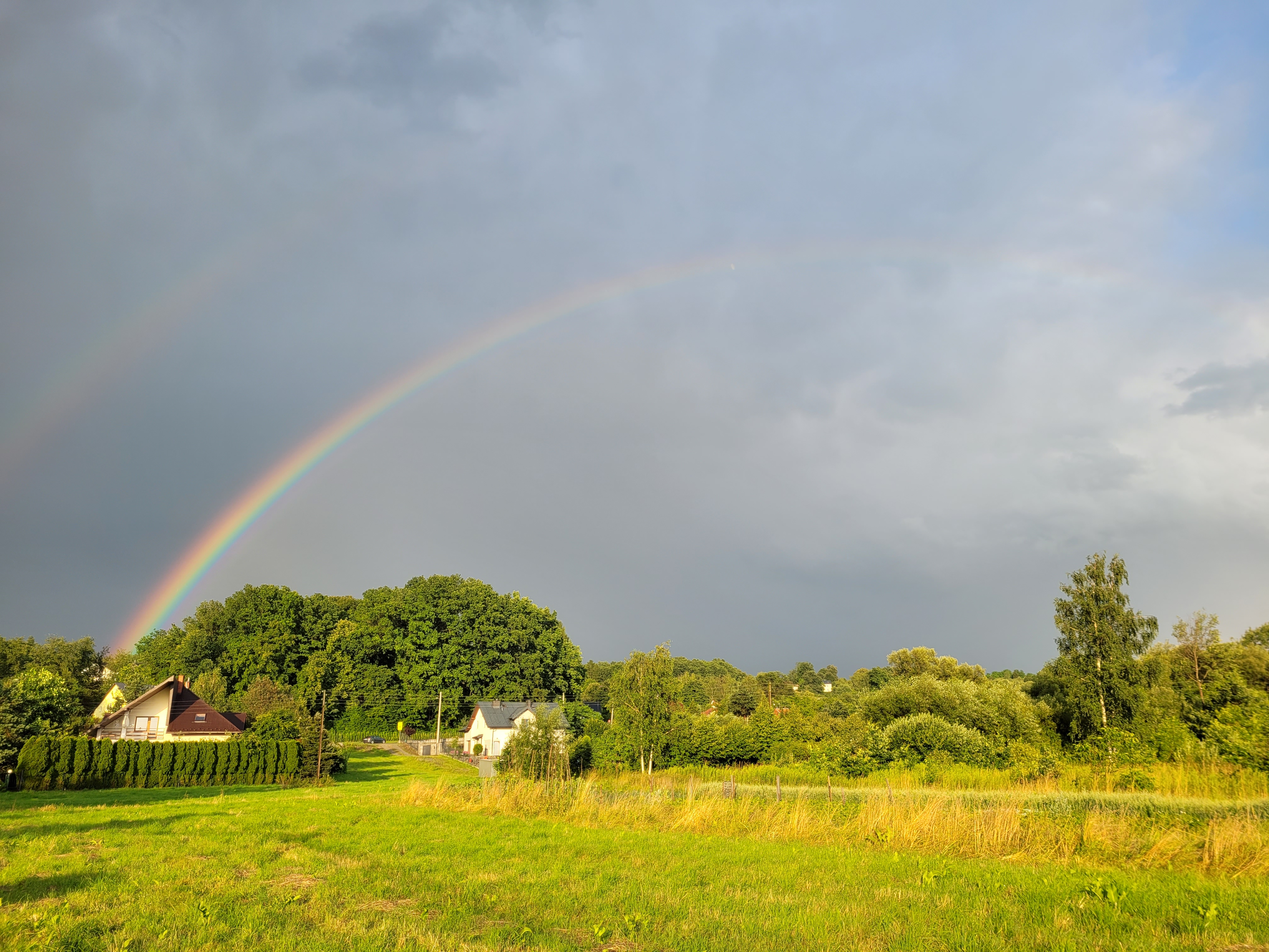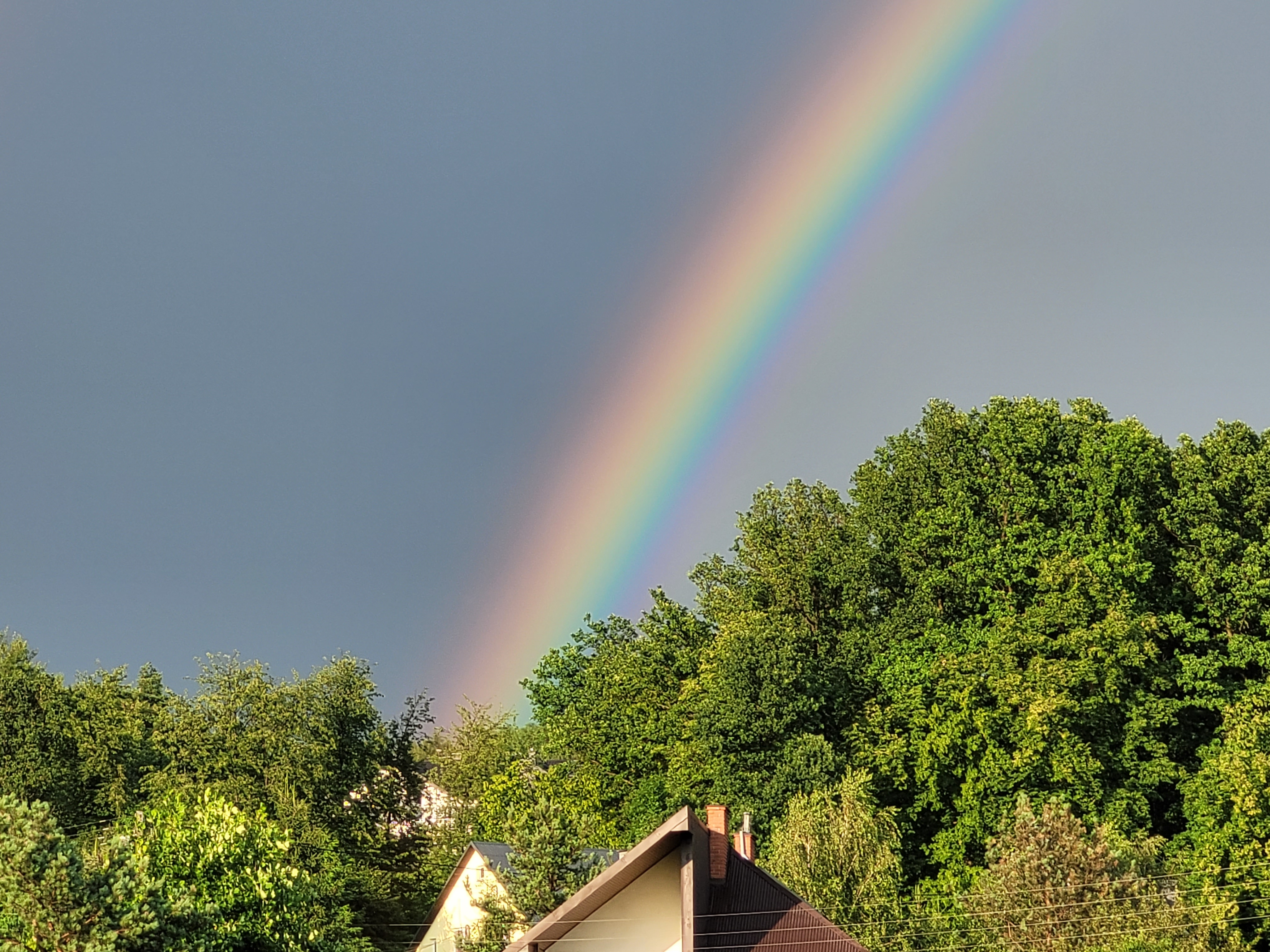 PiotrNS - 20 Lipiec 2023, 19:38 Dzisiejsza wieczorna ulewa rozpoczęła się w prawdziwie mrocznej scenerii. Zerwał się wiatr, a niebo zajęły ciemne chmury. Po kilku minutach chmury zaczęły jednak ustępować, a padający nadal deszcz umożliwił wystąpienie najpiękniejszej tęczy w ostatnich latach, od 2 maja 2020