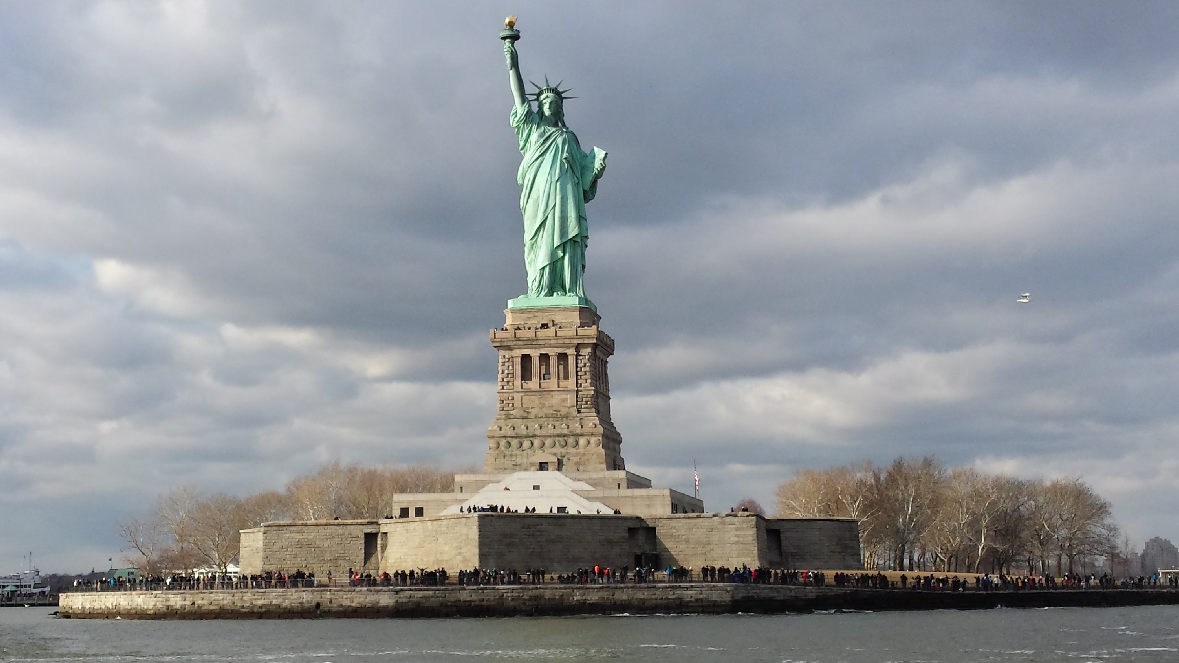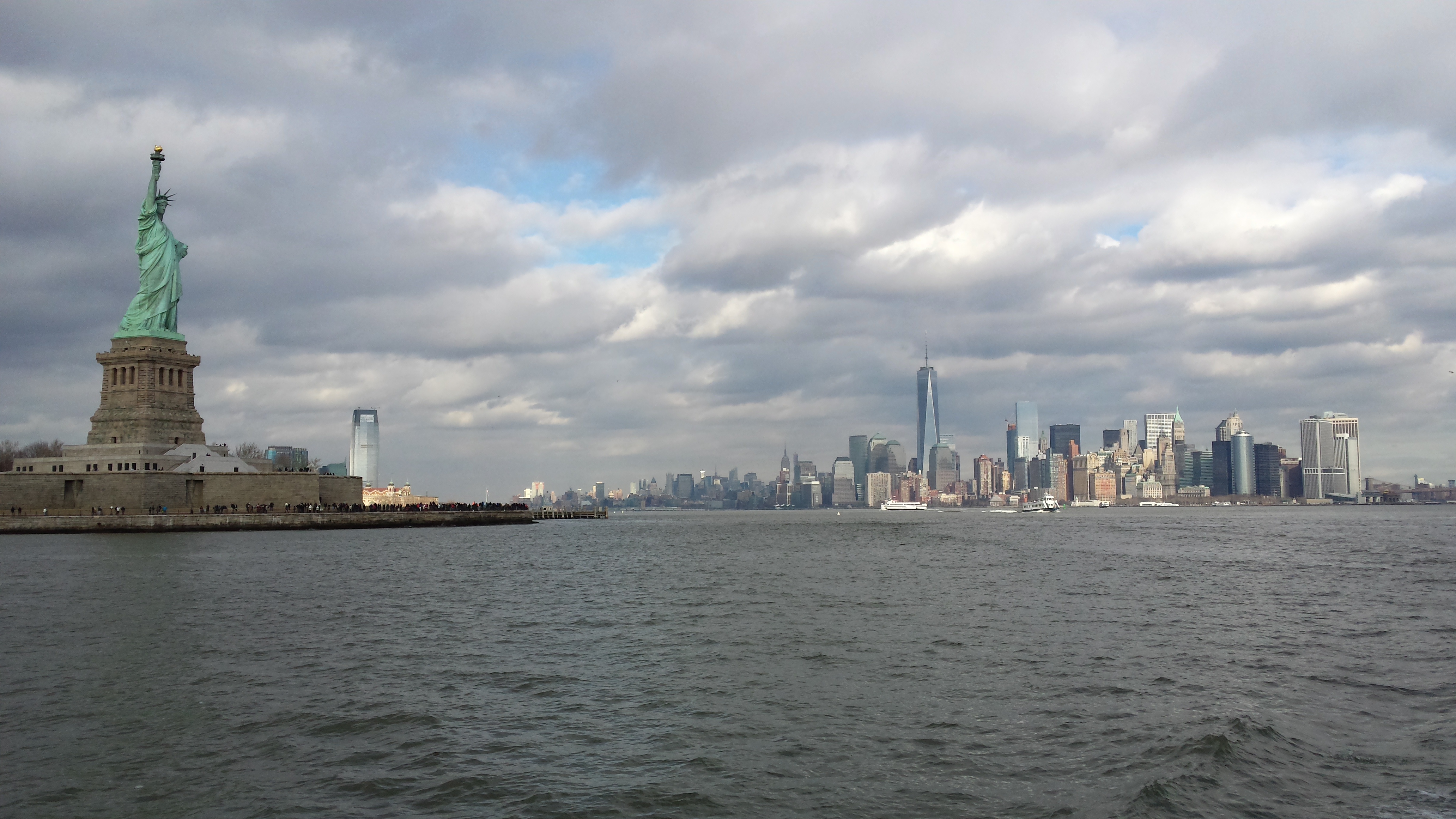Już płynąc statkiem na wyspę czułem zimno. Wzmagający się wiatr wiał prosto w twarze, a odczuwalna temperatura mieściła się koło zera. Do tego wszechobecna wilgoć nie pomagała. Mimo to, nic nie przeszkadzało dobremu humorowi, nawet dreszcze na całym ciele. No bo jak tu nie docenić tak wspaniałego widoku na Dolny Manhattan?