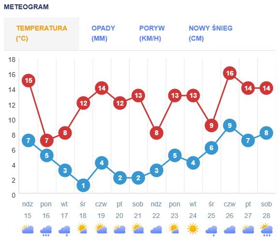 Na wykresie średnie balansują w granicach 10-15 C za dnia (no w niektórych dniach 5-10 C), nocami na ogół kilka C na plusie (ale wiadomo przy pogodnej, bezwietrznej aurze i braku zagrożenia opadami minimalne wartości na termometrach mogą okazać się niższe, czyli w okolicach 0 C lub z przymrozkiem)