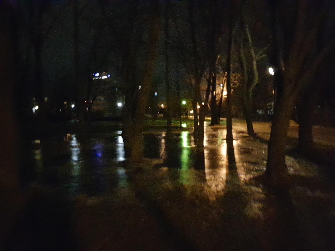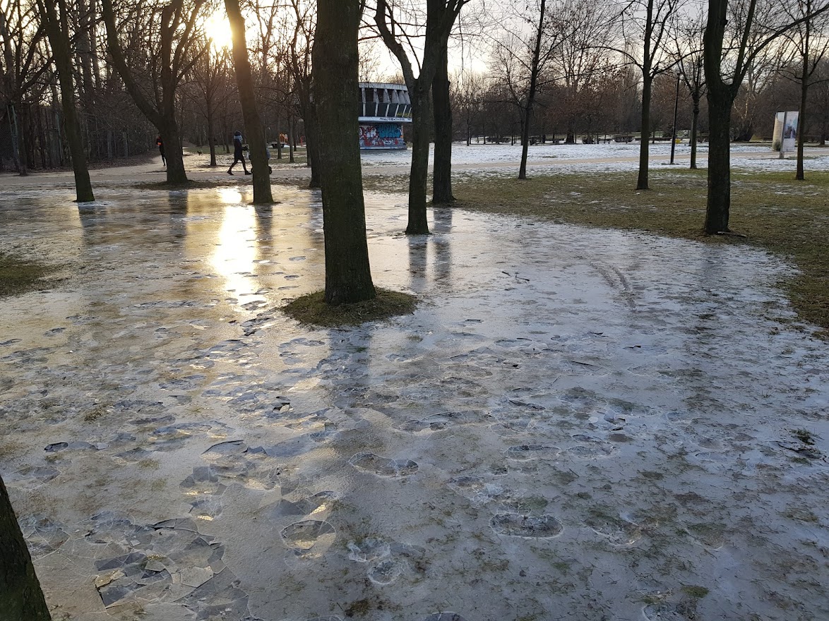 Jeszcze wieczorem miałem jakieś korepetycje jeśli dobrze pamiętam, a wracając się przeszedłem przez Pola Mokotowskie. Gdy zobaczyłem jak dosłownie cały park znalazł się pod wodą, postanowiłem, że w kolejnym dniu, jak po mroźnej nocy się skuje, pójdę tam się poślizgać Jedyny plus bezśnieżnych mrozów.