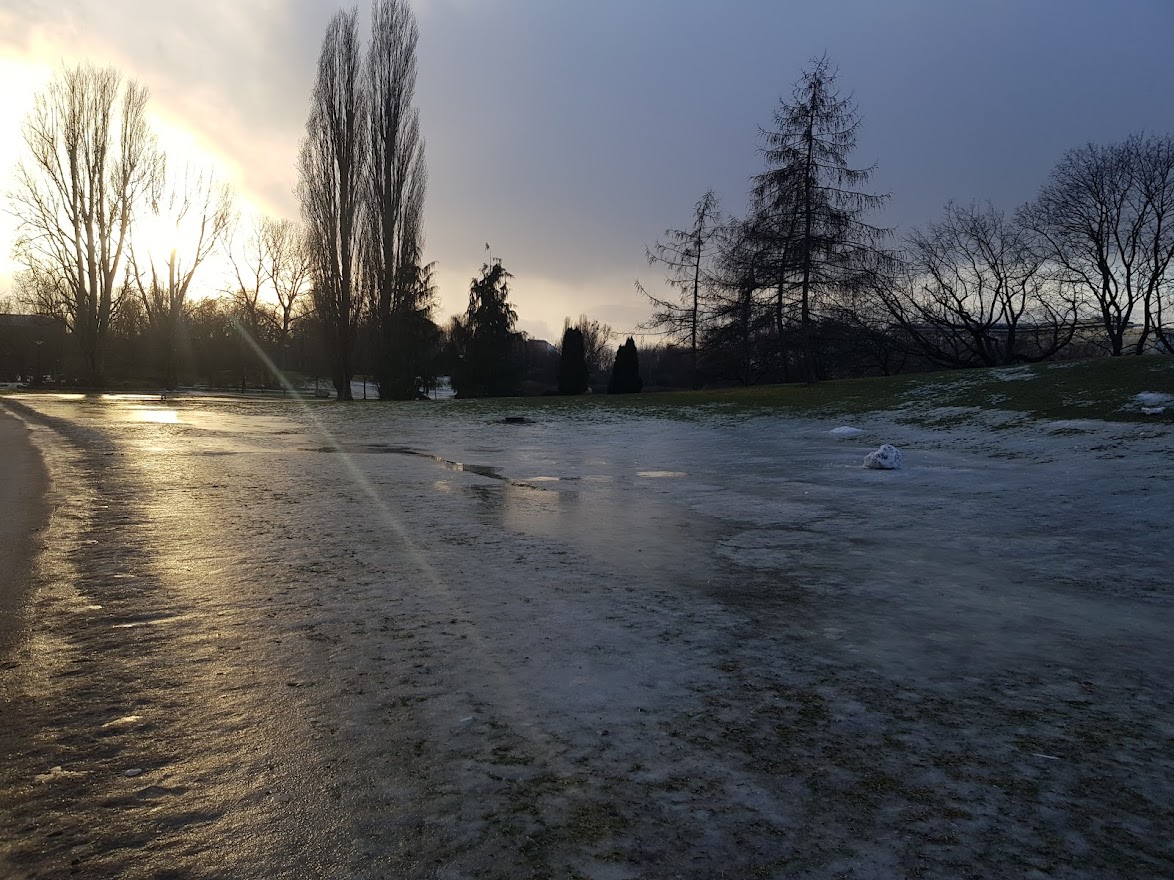 Około 15:00 wyruszyłem do parku na ślizganie się, zgodnie z tym co zaplanowałem dzień wcześniej. Trzeba przyznać, że wynagrodziło to szarugę, której przy takiej ilości zamarzniętych rozlewisk się nawet tak nie czuło