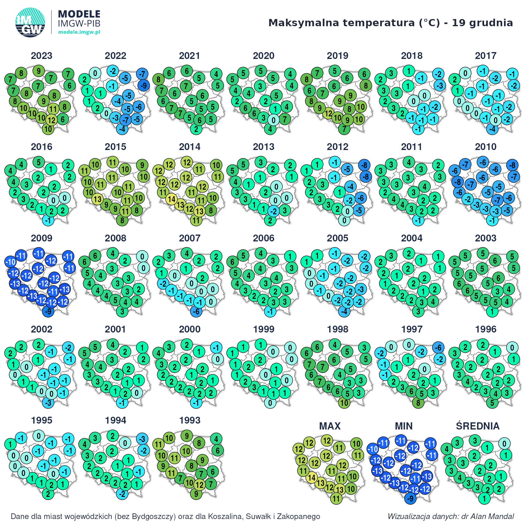 Aż trudno to sobie wyobrazić Oby tej zimy była najwyżej połowa tego Bartek617 - 18 Grudzień 2024, 23:04 Mrozy w ostatnich zimach raczej nie wybiegają poza -10 C, przynajmniej mój termometr nie widział chyba nigdy więcej niż kilka C mrozu na przestrzeni ostatnich 10 lat (jeśli się jednak zdarzały, to w pojedynczych ilościach). pawel - 19 Grudzień 2024, 10:28 A mój termometr widział -24 choćby 9 stycznia... 2024 Janekl - 19 Grudzień 2024, 11:28 Jak widzę u mnie to ostatni raz -20 stopni miałem w styczniu 2014 roku a rok wcześniej nawet w marcu i to 13-tego było prawie -20 stopni. A w 2012 roku 5 -30 stopni a 6 lutego lekko przekroczone -30,3*C. A cały tydzień z minimalną poniżej -20 stopni. Na to wygląda ,że już ponad 10 lat nie było przekroczone -20 stopni więc zimy są na prawdę coraz cieplejsze. A zima 2019/2020 nawet temperatura nie spadła do -10 stopni a najzimniejszy dzień był dopiero 14 marca -8,8*C. Nawet zima 1989/1990 miała niższą minimalną od tej.LukeDiRT - 19 Grudzień 2024, 15:29 19 grudnia był dość ciepłym dniem na przestrzeni ostatnich 30 lat. Dwucyfrowa temperatura miała miejsce aż 5 razy.