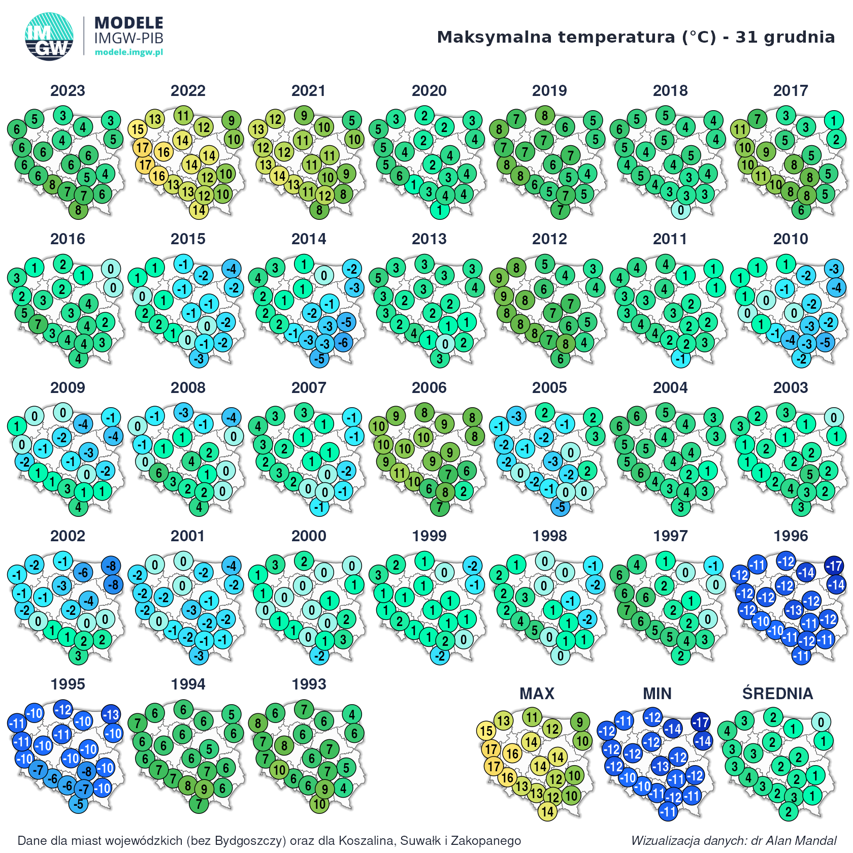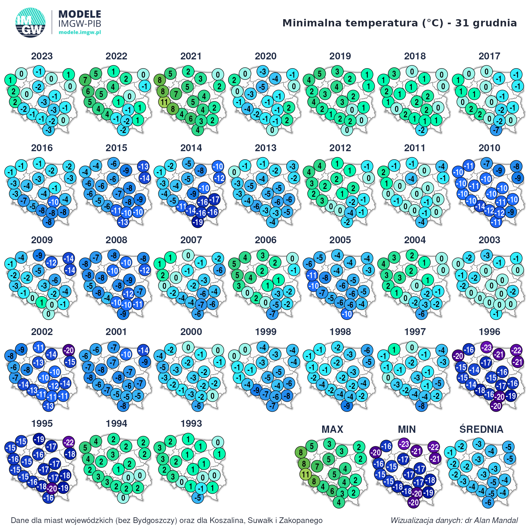 Najbardziej rzucają się w oczy ekstremalnie wysokie temperatury w 2021 i 2022 roku.Janekl - 31 Grudzień 2024, 09:14 Tym razem nawet Suwałki były cieplejsze od Gdańska w 1996 roku jeśli chodzi o minimalną.PiotrNS - 31 Grudzień 2024, 13:42 Odcinek 366/366