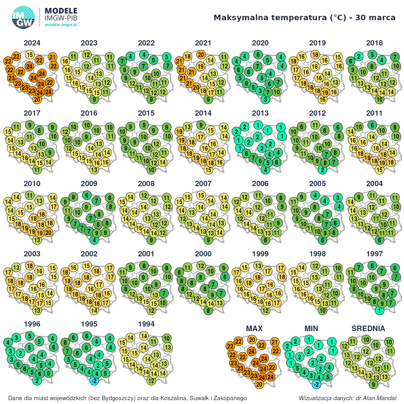 Janekl - 30 Marzec 2025, 19:54 U mnie 30 marca 2021 roku tylko 17,1*CBartek617 - 30 Marzec 2025, 21:48 To miałeś w bardzo dużym uproszczeniu podobne lub wyższe temp. od ok. 50% Polski LukeDiRT - 31 Marzec 2025, 07:33 31 marca