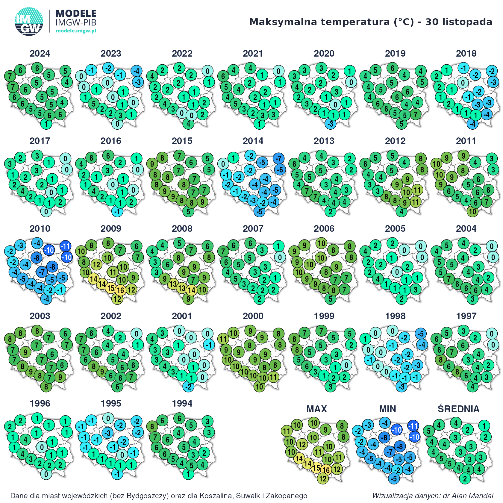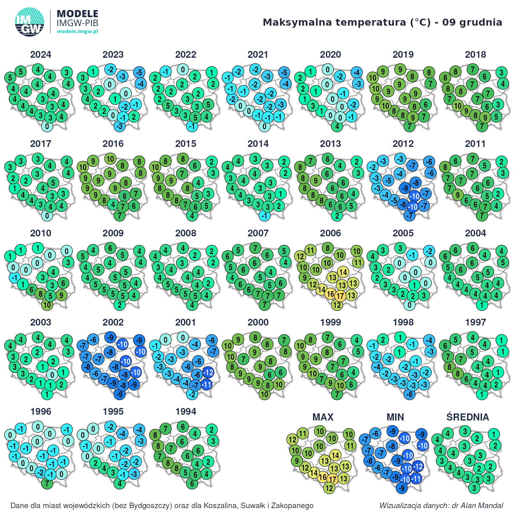 Na uwagę zasługuje bardzo ciepły 30.11.2009 oraz bardzo mroźny 30.11.2010.Bartek617 - 30 Listopad 2025, 11:32 Przy 2-cyfrowych maksach w porze chłodnej to jednak trzeba uważać, bo w jednym miejscu termometr ci wskaże ok. +15 C, w drugim niedaleko niego się znajdującym poniżej +10 C W wakacje wiadomo dzień trwa długo i temp. rosną do potencjalnie nadciągającego załamania pogody, które w większości przypadków nie powinno trwać dłużej niż ok. godziny Ale gdzieś od listopada do maja włącznie jak występują spore dobowe amplitudy, to godzinówki są w większości na ogół bliżej dołu niż góry, więc o wartości za dnia "z kosmosu" jest wtedy nietrudno Wolę dlatego już to co mamy obecnie- temp. zbliżone do siebie całą dobę, sporo chmur na niebie i wysoka wilgotność powietrza (owocująca podobnymi temp. powietrza do punktów rosy), ale bez opadów LukeDiRT - 9 Grudzień 2025, 06:07 9 grudnia