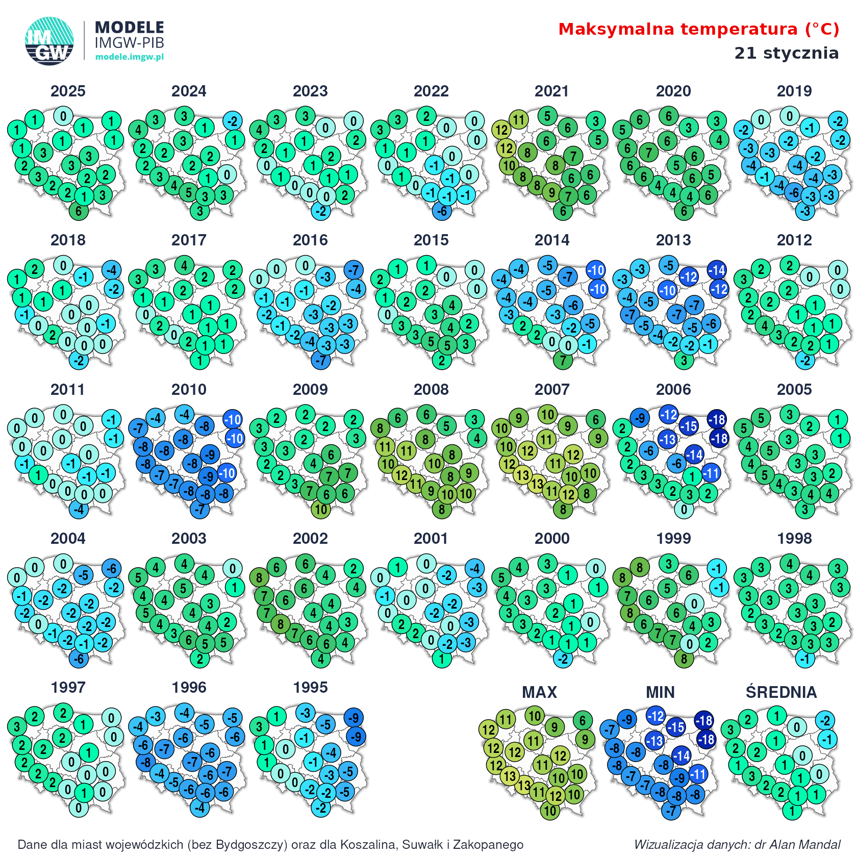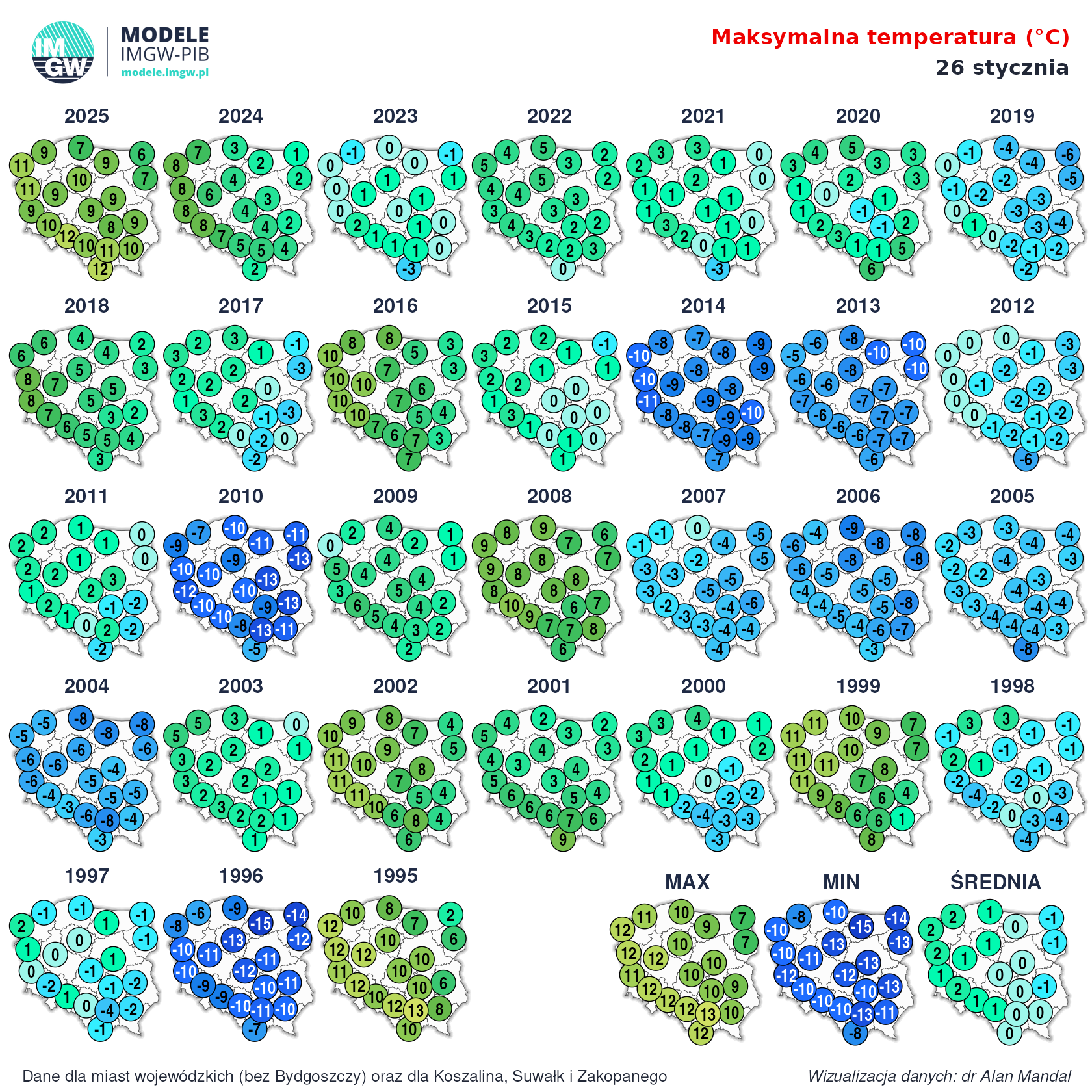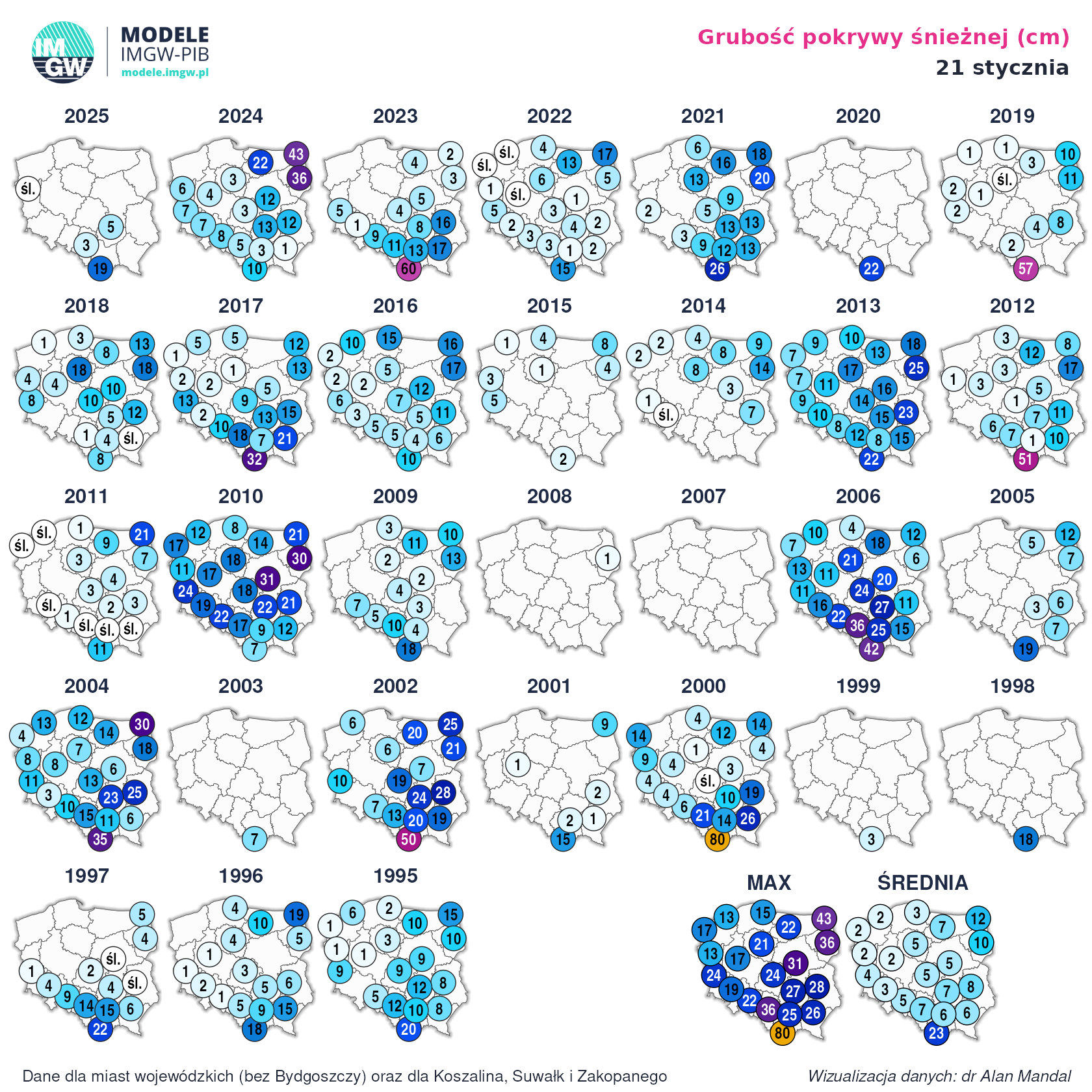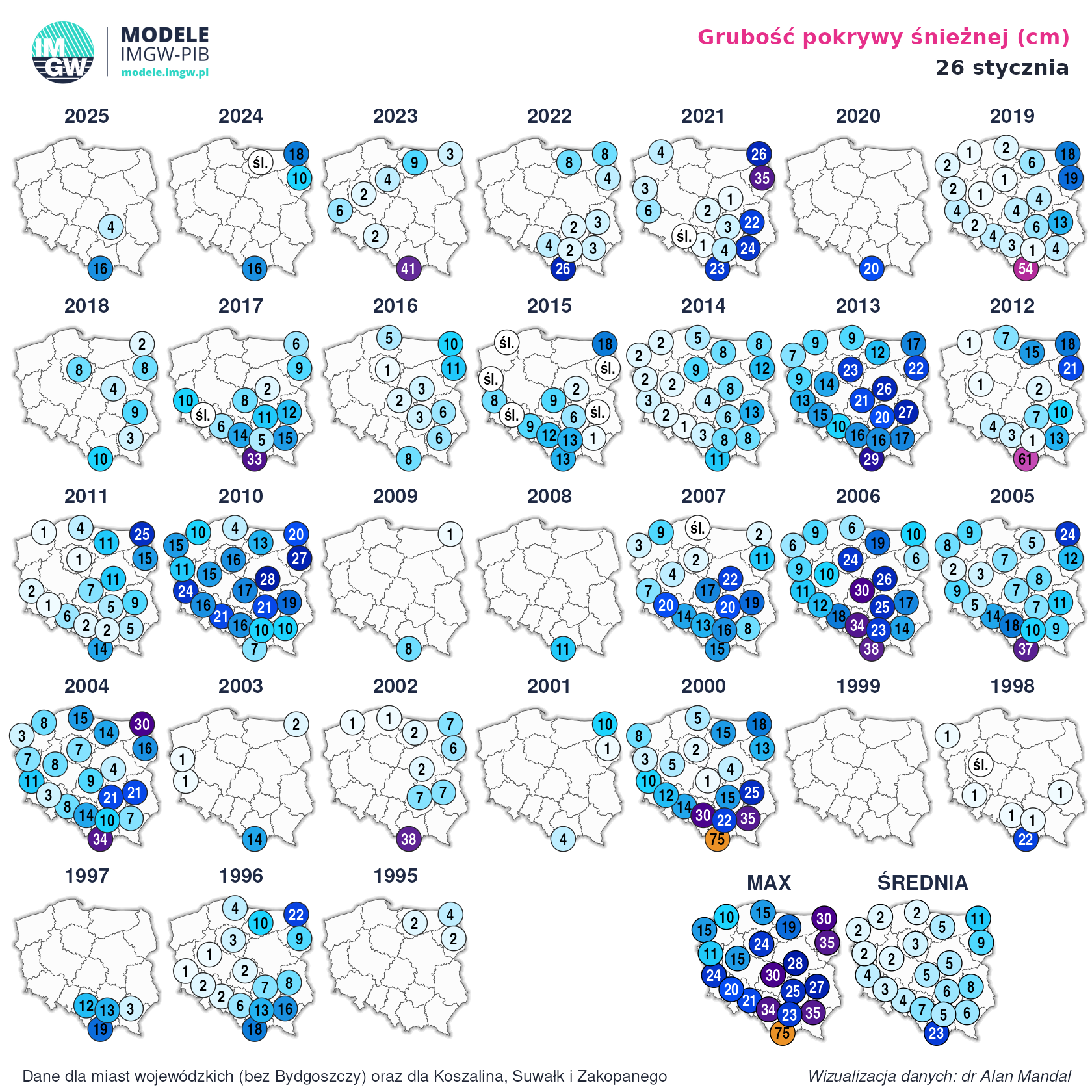 Grubość pokrywy śnieżnej Bartek617 - 26 Styczeń 2026, 11:21 Przełom stycznia-lutego był zwykle czasem redukcji bieli na nizinach, neutralizacji warunków na wyżynach plus niektórych obszarach podgórskich i umacniania terniczno-pogodowej zimy w górach Między Krakowem a Zakopanem np. w tym okresie zaczynały z reguły wyraźniej powiększać się różnice w kwestii poziomu temp. powietrza i pokrywy śnieżnej (można na mapach przynajmniej dostrzec, że prawie zawsze jakaś pokrywa się na Podhalu wówczas pojawia, co jakieś 1-1.5 miesiąca wcześniej nie jest do końca taką oczywistością)