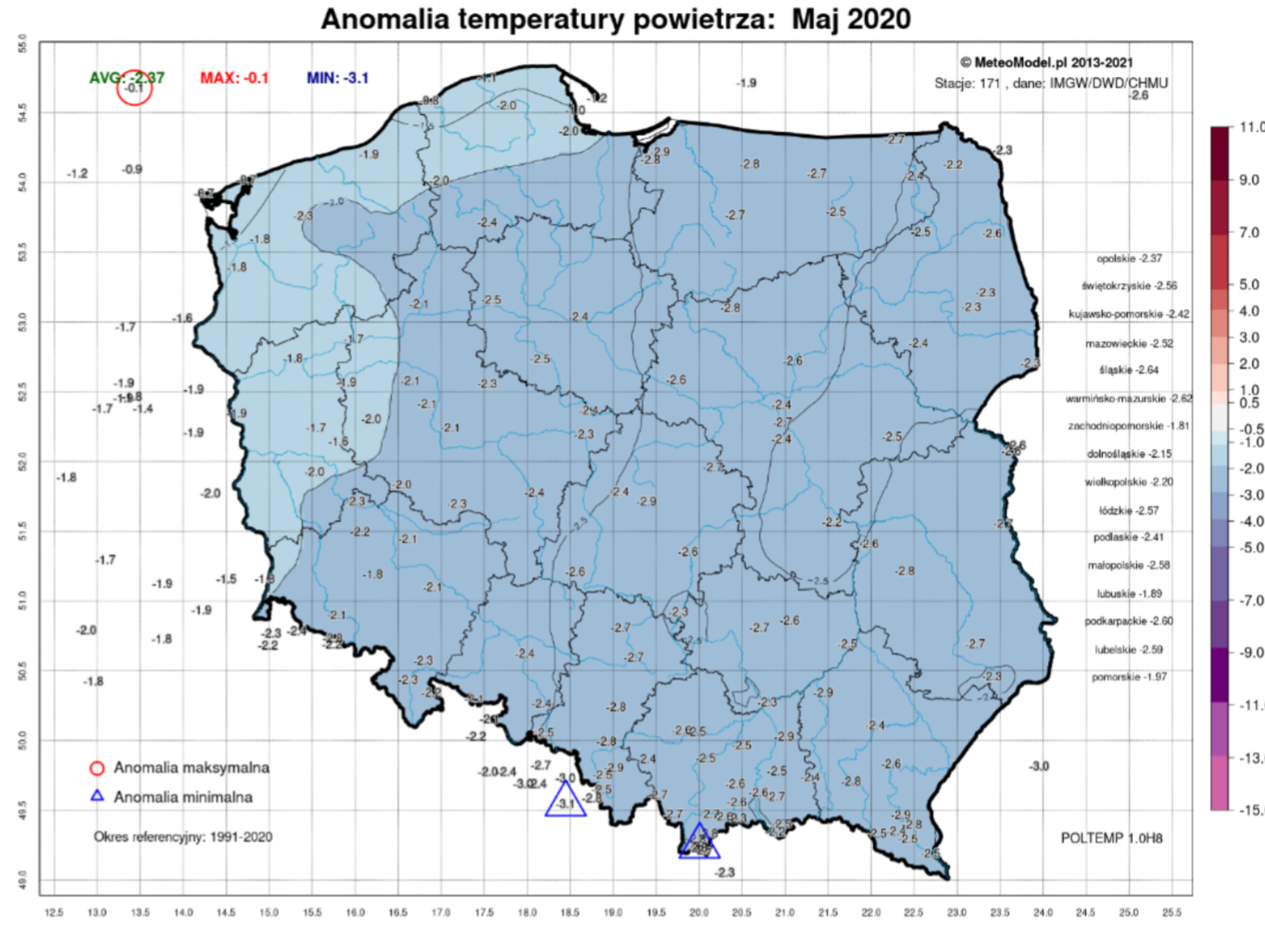 Nocne temp. co prawda mogą nie być za niskie, ale mam nadzieję, że wyjdą na ogół nie wyższe niż +10 C Janekl - 23 Maj 2025, 08:40 Na to wychodzi ,że w tym roku w maju mogę mieć tylko 2 razy kiedy maksymalna przekroczyła 20 stopni. Od 1990 roku w 1991 i 2020 roku dwudziestkę miałem tylko raz w maju a w 1991 roku było to dopiero ostatniego maja. Na to wychodzi , ,że maj u mnie przez ostatnie 35 lat miał chociaż raz a wrześnie nie zawsze chociaż są trochę cieplejsze ale wynika to z tego ,że przymrozków w maju jest więcej i praktycznie u mnie zawsze a we3 wrześniu dużo rzadziej.Jacob - 23 Maj 2025, 12:29 Majuś 5-lecia jednak nie 20-lecia