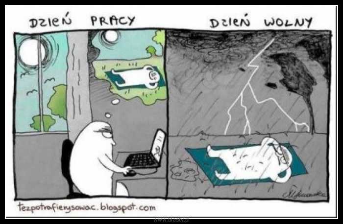 Swoją drogą często się tak dzieje, że najbrzydsza pogoda ma miejsce w dni wolne od pracy (sobota-niedziela). Ja mogę w dni upalne jeździć na rowerze... wieczorem, jak jest przy pogodnym niebie dużo chłodniej. Mapka z szerokim pasmem sukcesów do mnie nie pasuje (choć kilka l. temu pewnie miałbym odmienne zdanie). zgryźliwy tetryk - 11 Maj 2021, 22:32