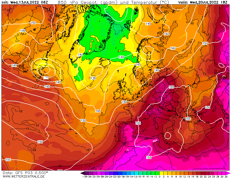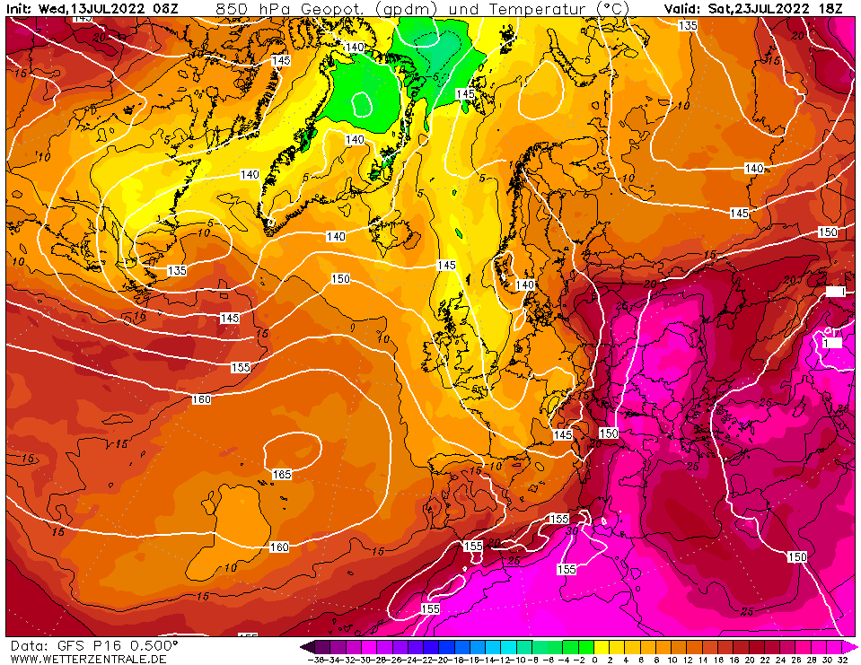 Jeśli chodzi o ekstremalne ciepło w październiku, to nawet jestem "za" przekroczeniem +30 C, ale na zasadzie 1-dniowego incydentu (na formalny znak, że coś takiego się pojawiło). Nie chciałbym jednak, by później "w ramach zapłaty" pojawiło się głębokie ochłodzenie- zauważyłem, że państwo ukraińskie jest bardziej podatne na takie anomalie termiczne: w pierwszych dniach potrafi być gorąco, wręcz na granicy z upałem, ale w środku czy pod koniec miesiąca temp. dzienne też bardziej ochoczo (niż u nas) lubią się mieścić w okolicach 0 C- zwykle powodem nie są całodobowe chmury warstwowe czy mgły (jak patrzyłem na stacje synoptyczne przynajmniej) tylko raczej większa skłonność do opadów mieszanych i stałych... FKP - 13 Lipiec 2022, 17:14 Bartek617, pawel - 13 Lipiec 2022, 18:39 To absurd na 20 lipca(daję mapy z T850):