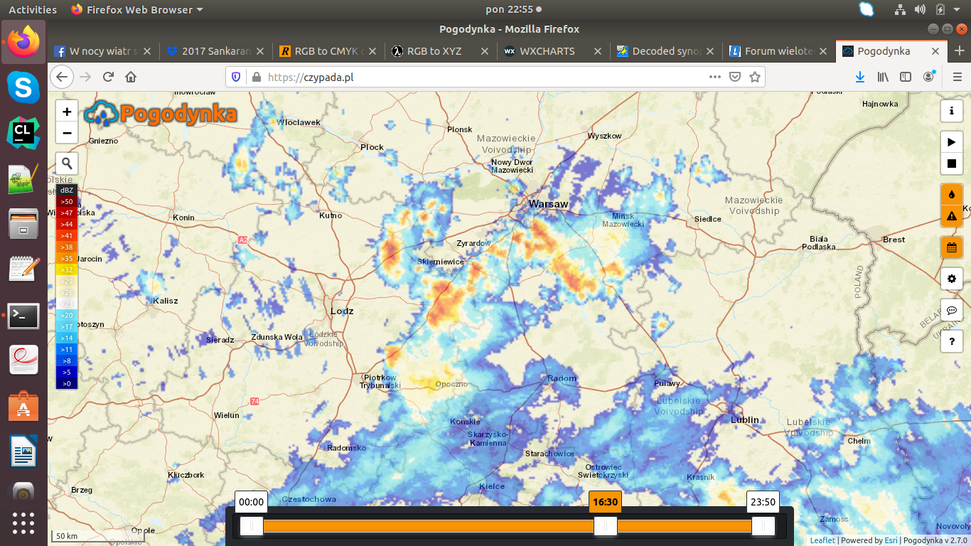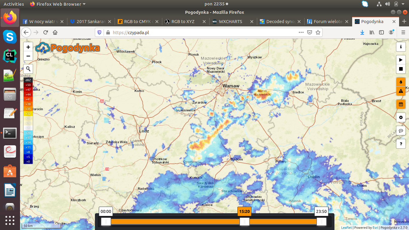 Jakby przyszło po takim samym maju normalne lato, z normalnymi opadami tj. 10 lat wcześniej, to byście się tak nie czepiali tego kwietnia kmroz - 20 Styczeń 2020, 23:05 W dniu 29.04.2019 na południu kraju była kontynuacja ciągłych, umiarkowanych opadów, w tym samym czasie właśnie na wschodzie kraju zaczęły wykluwać się komórki burzowe (przyznam, że mnie trochę zaskoczyły). Pierwsze z nich zaczęły się pojawiać jeszcze przed 14:00 na granicy woj. mazowieckiego i podlaskiego. Po 15:00 można było już dostrzec łańuch burz (tzw. training storms), ciągnący się wdłuż DK50 od Mińska do Grójca i dalej na południowy zachód aż po Opoczno. Nie przesuwał się on jednak w 100% równolegle, lecz minimalnie przesuwał w kierunku zachodnim.