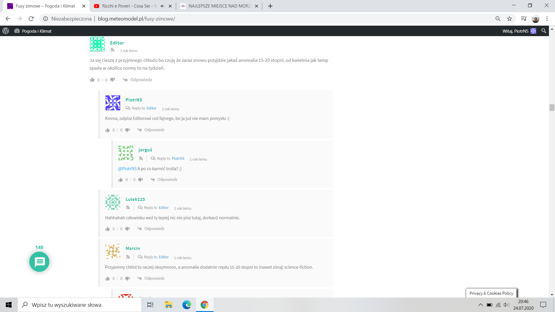 https://blog.meteomodel.pl/mrozna-noc/kmroz - 24 Lipiec 2020, 21:14 Pamiętam, nawet wstawiałeś już ten komentarz na to forum chybaPiotrNS - 24 Lipiec 2020, 21:17 Faktycznie, ale wtedy chyba Jorguś go nie widział, a to on mnie wtedy postawił do pionu Chociaż miętowy awatar raczej nie jest trollem, czego nie da się powiedzieć o tym drugim Muszę jeszcze poszukać tego sformułowania "jest tak cudownie aż trudno uwierzyć", które sobie przywłaszczyłem 3 lipca ubiegłego roku, choć teraz już bym tak o tym dniu nie napisał.kmroz - 24 Lipiec 2020, 21:32 Pamiętam, wtedy to mi się wydawało, że Jorguś to jakiś gość po 40ce XD Zresztą o Tobie jak pewnie wiesz też myślałem, że byłeś starszy, zmylił mnie wiek Twoich rodziców (o którym już na meteomodel mówiłeś, chyba apropos ich matury po słynnej upalnej majówce 1977), oraz relacja z 11.05.2009, która brzmiała, jakby co najmniej 17-18 latek był jej bohaterem.