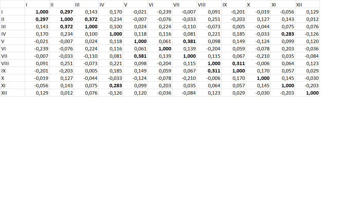pawel - 10 Luty 2021, 11:40 Współczynniki korelacji między miesiącami dla woj. małopolskiego z lat 1930-80(przyjęto poziom istotności p=0,05, załapały się współczynniki>0,276 oraz <-0,276).