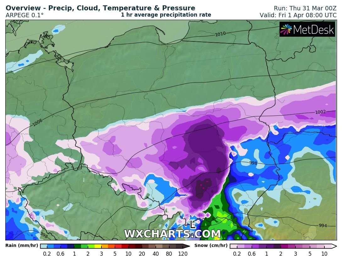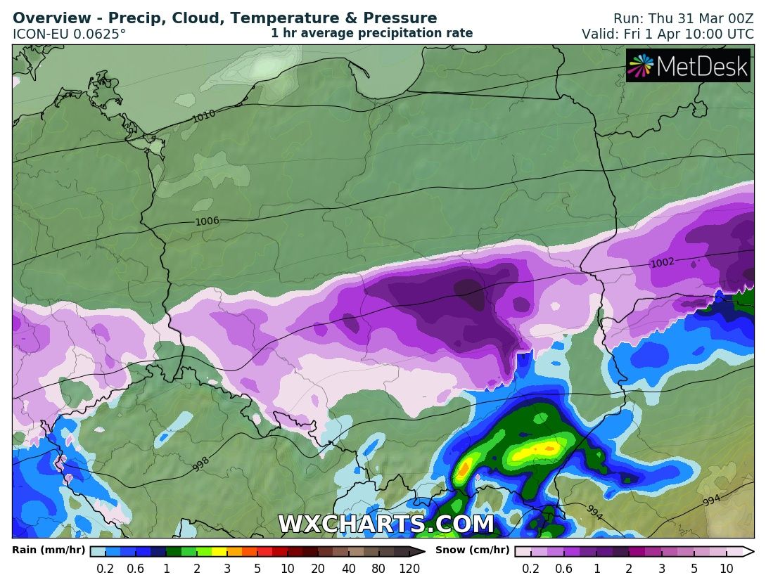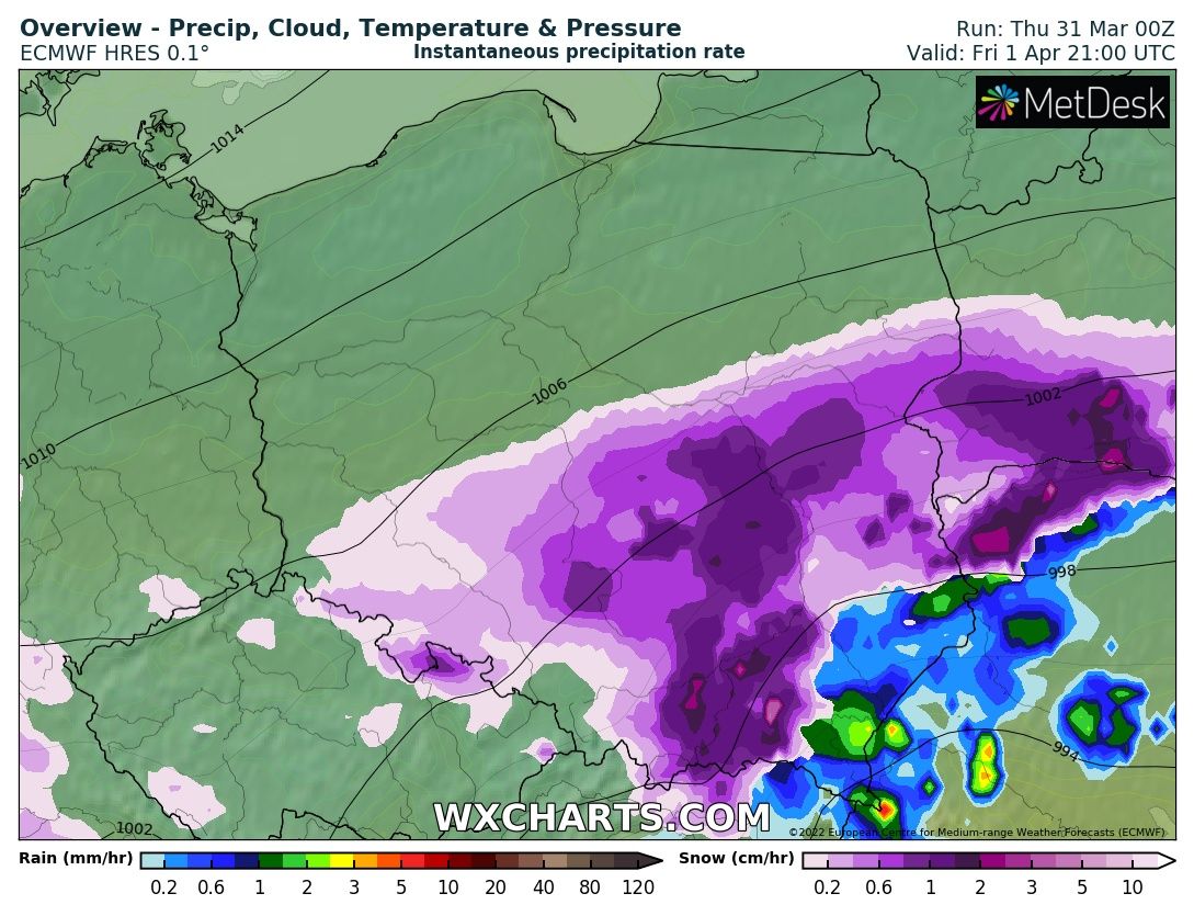 Może najgorszego uda się uniknąć: temp. nieco się wprawdzie obniżyła (niewiele powyżej +4 C) i okresami jakieś pojedyncze kropelki deszczu lecą... Wiatr się przebudził, co potęguje odczuwalny chłód- kiepsko, ale w sumie na tle największych załamań i tak jeszcze jest "zajebiście". jorguś - 31 Marzec 2022, 17:12 Jestem bardzo ciekawy tego co się zdarzy, tak sytuacja meteo nie żyłem chyba od 17.12 xdkmroz - 31 Marzec 2022, 18:24 No ja też,jutro zarówno mogę mieć brejowaty puderek jak i10cm śniegu. Cokolwiek się nie stanie, to na duchu podnosi przyszły tydzień.Bartek617 - 31 Marzec 2022, 18:47 Ja tak ciągle panikowałem, co ten "różowy" kolor na mapach robi, a nie zdawałem sobie sprawy, że pod nim może być schowany "niebieski": coś tak czuję, że przynajmniej bezpośrednio u mnie (bo w miejscach wyżej położonych już może być i pewnie będzie niezbyt wesoło, ale też oczywiście nie tak źle jak na obszarach podgórskich i górskich) opad przybierze głównie postać mieszaną, a sytuacja raczej będzie na granicy "nędznej" kwietniowej normy (jak coś się pojawi, to raczej góra puder w otoczeniu kałuż, na powrót zimy z prawdziwego zdarzenia raczej nie liczę). Rejon Krakowa ma jednak pod tym względem "normalną" pogodę i najwyższa pokrywa pada z reguły na przełomie stycznia-lutego (ewentualnie lutego-marca, jak zima jest konkretniejsza i przeciąga się w czasie), a nie poza sezonem.