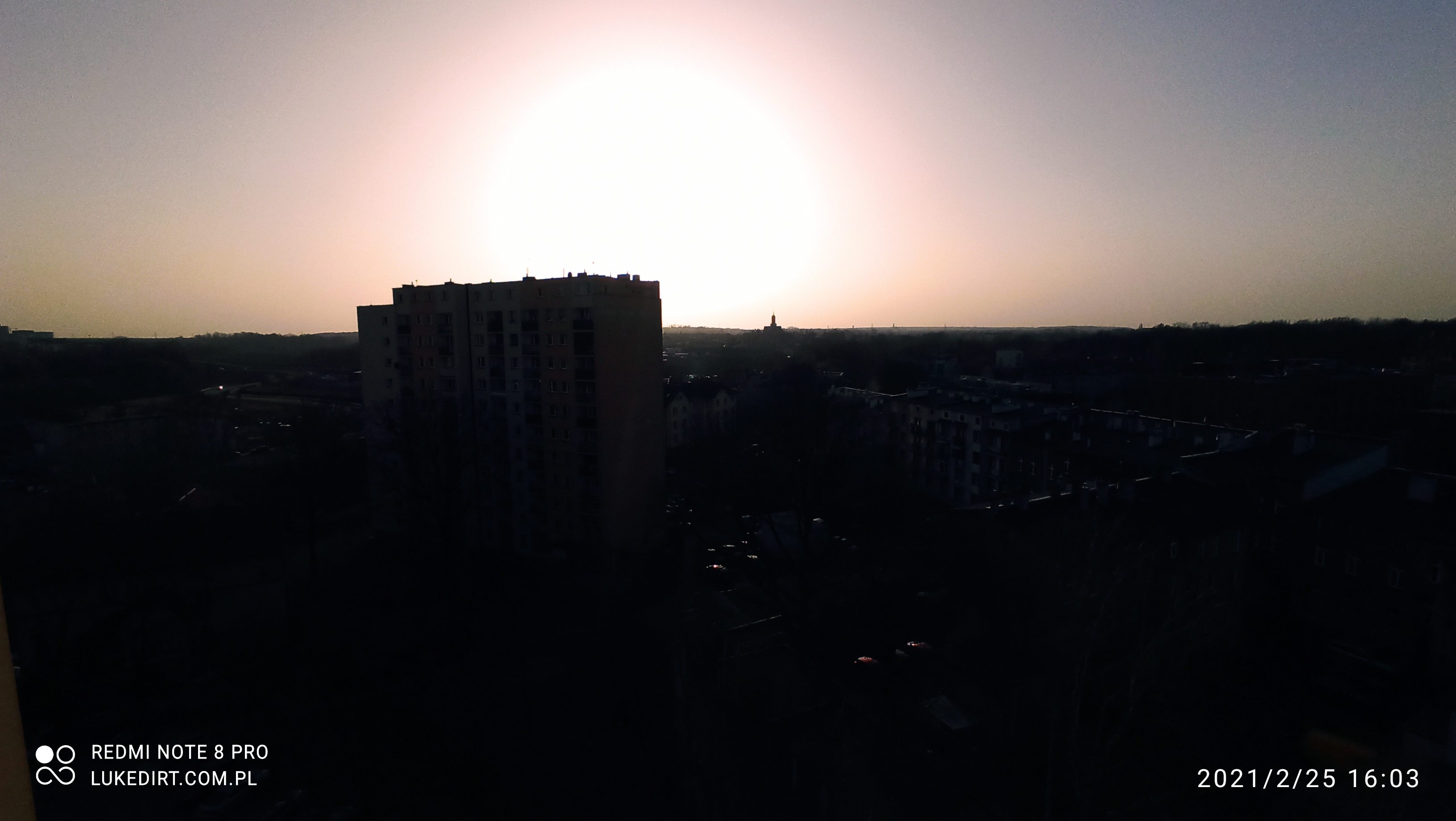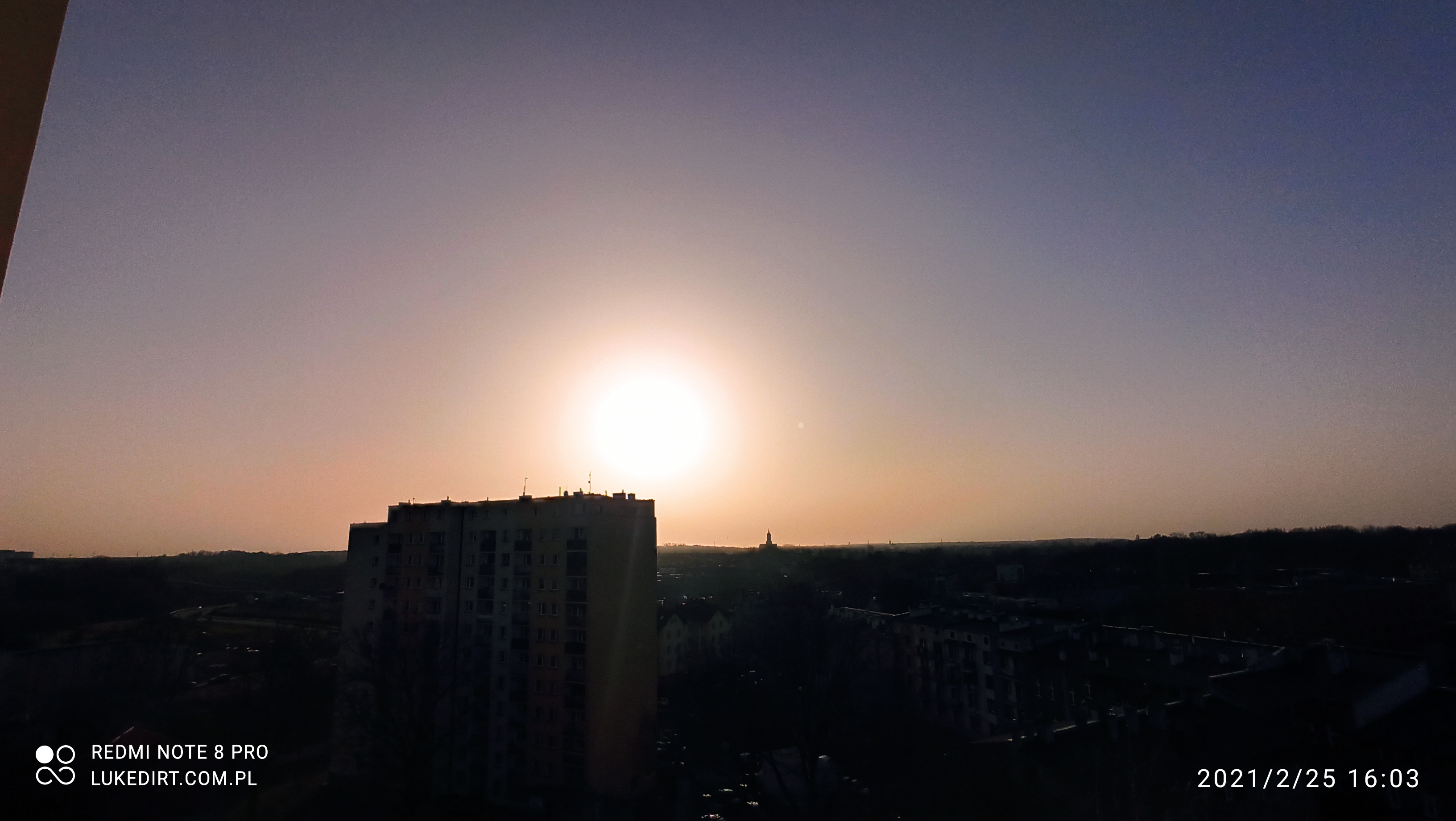 24 lutego 2021 był jeszcze bardziej ekstremalny. Ale nawet te bardzo wysokie temperatury, osiągające a lokalnie nawet przekraczające 20 stopni, nie spowodowały całkowitego roztopienia pokrywy śnieżnej oraz lodu. Z kolei tuż przed zachodem Słońca niebo zabarwił pył saharyjski, którego najwięcej było dzień później...