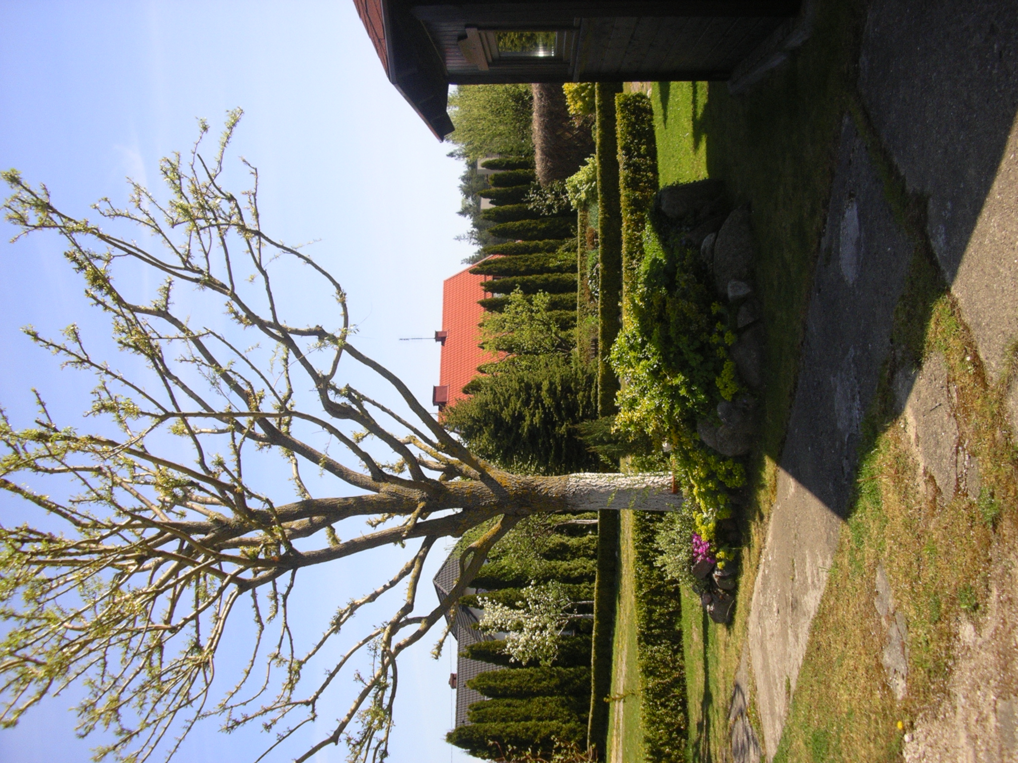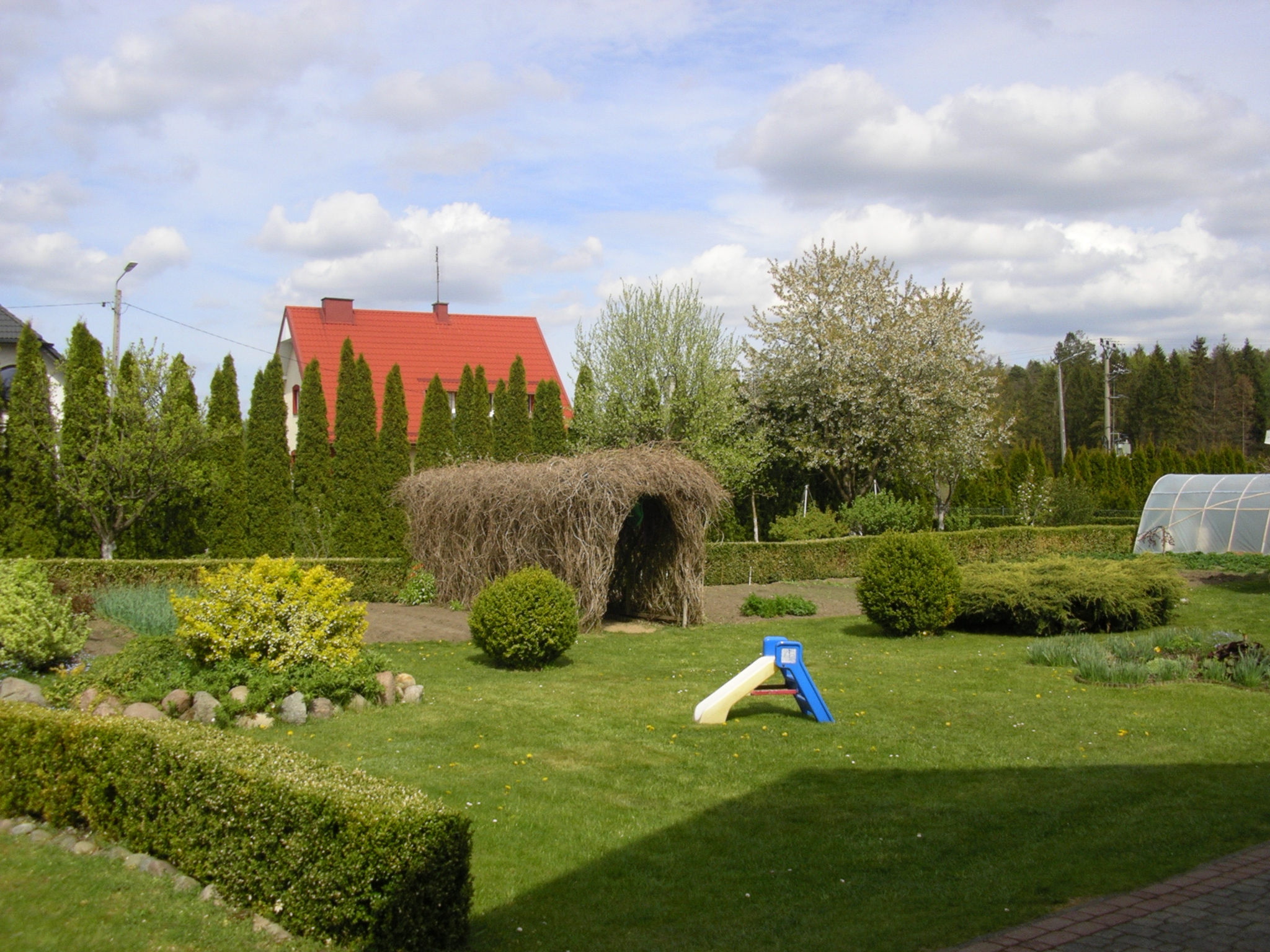 A pergola całkiem łysa winobluszcz dopiero zacznie zielenieć.