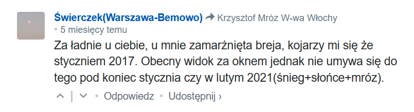 Antywczesnowiosnowcy - przeciwnicy zbyt wczesnej wegetacji, zwłaszcza kwitnienia drzew owocowych To słowo wymyślił wczoraj FKP, więc prawa autorskie należą do niego Bartek617 - 30 Kwiecień 2022, 16:33 Chyba do takich osób należę. kmroz - 7 Maj 2022, 20:52 "Burza śnieżna" - określenie na burze występującą przy ujemnej anomali temperatury - w przypadku lipca jest to burka przy np 20 stopniach, a w przypadku sraja przy 15 stopniachkmroz - 17 Maj 2022, 14:29 Zamarznięta breja - Z pozoru oksymoron, ale określa to pseudopokrywę śnieżną, zwykle bardzo niewielką i zdewastowaną przez niewielką odwilż, istotnym elementem jest całkowita łysina krajobrazu (drzewa, krzewa, często nawet dachy). Jest to w sumie synonim pudru, chociaż sam w sobie puder to po prostu mała pokrywa, a przy zamarzniętej brei koniecznym warunkiem jest zamieszanie się zafajdanej odwilży