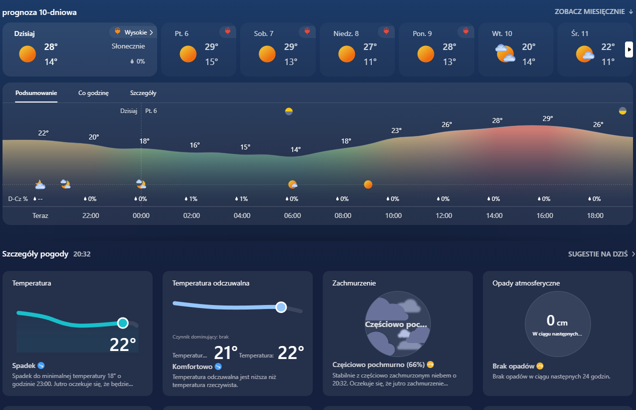 U siebie też przerabiałem wiatr minionej nocy. Ale po 2. ucichł i Tmin i tak wyniosła 13°C - wcześniejsze noce to Tmin po 10-11°C.LukeDiRT - 5 Wrzesień 2024, 10:38 U mnie teraz jest już 27*C przy bezchmurnym niebie i dość silnym wietrze ze wschodu Z kolei nad ranem temp. min. spadła do 17,1*C, czyli było cieplej niż podczas ostatnich dwóch nocy. Jednak wiatr, mimo że wschodni, ograniczył uciekanie ciepła do atmosfery.Janekl - 5 Wrzesień 2024, 16:14 Dzisiaj przez cały dzień świeci słabo słońce przez chmury i wieje dość mocno. Na termometrze 25,8*C ale odczuwalna jakieś 22 stopnie.zgryźliwy tetryk - 5 Wrzesień 2024, 21:04 Janekl - 6 Wrzesień 2024, 07:57 Dzisiaj minimalna 12,7*C jest prawie bezchmurnie i słaby wiatr. Obecna temperatura 16,4*C.LukeDiRT - 6 Wrzesień 2024, 09:37 22,4*C i bezchmurnie, ale temp. min. spadła do 14,3*C Janekl - 6 Wrzesień 2024, 12:56 Przekroczone 25 stopni i dość mocno wieje więc odczuwalna super.Janekl - 6 Wrzesień 2024, 21:05 Dzisiaj dużo cieplejsza noc niż wczoraj bo jeszcze jest powyżej 20 stopni a dokładnie 20,8*C.LukeDiRT - 7 Wrzesień 2024, 12:27 Niemal bezchmurnie, a temperatura jak na razie wzrosła do 29,4°C. Nad ranem temp. min. spadła do 14,7°C wg mojej pseudoklatki, chociaż oficjalna stacja synoptyczna w Katowicach zanotowała zaledwie 12,6°C.Bartek617 - 7 Wrzesień 2024, 15:48