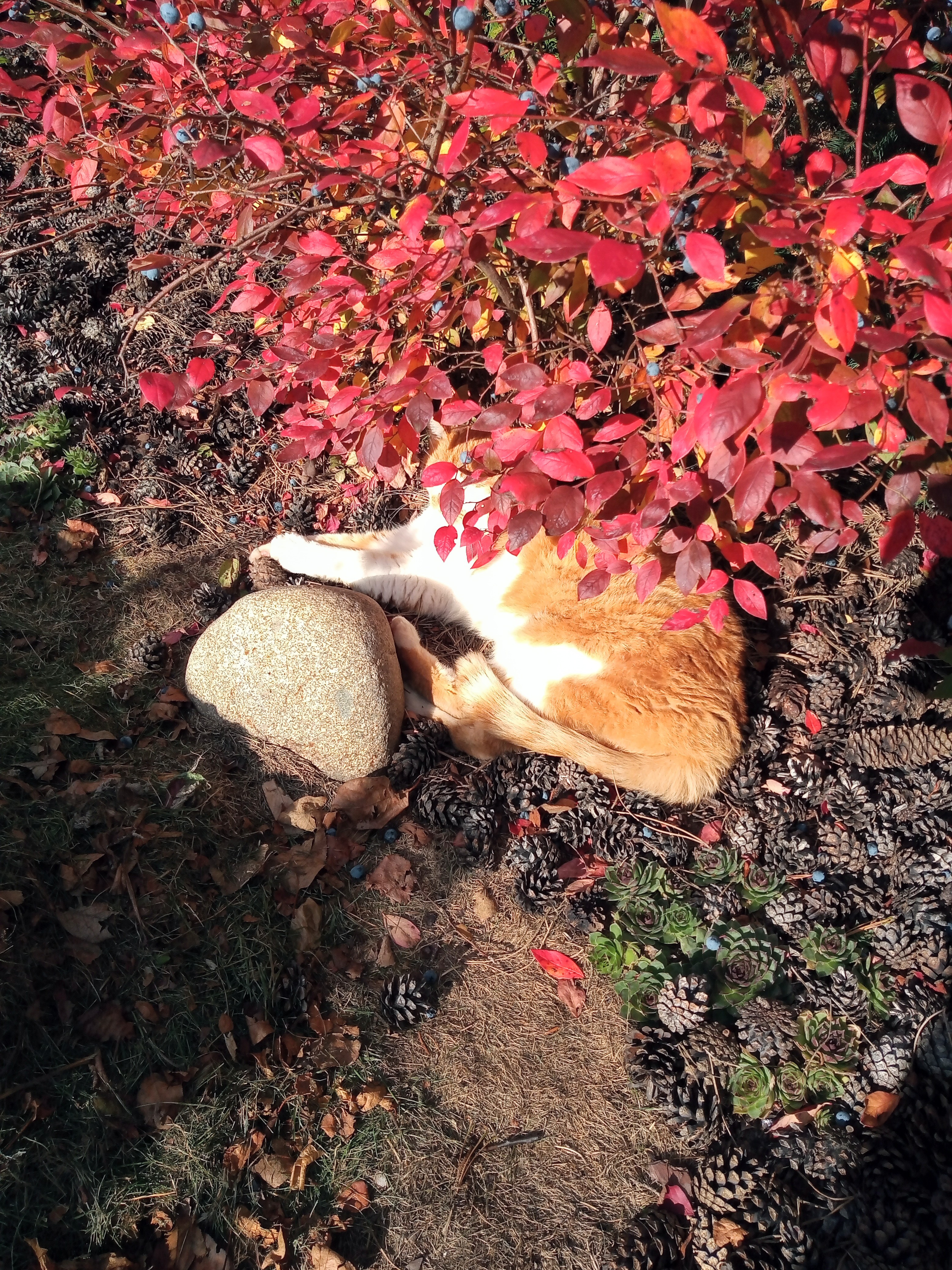 Kot korzysta z jesiennego słoneczka wygrzewając się pod borówką.