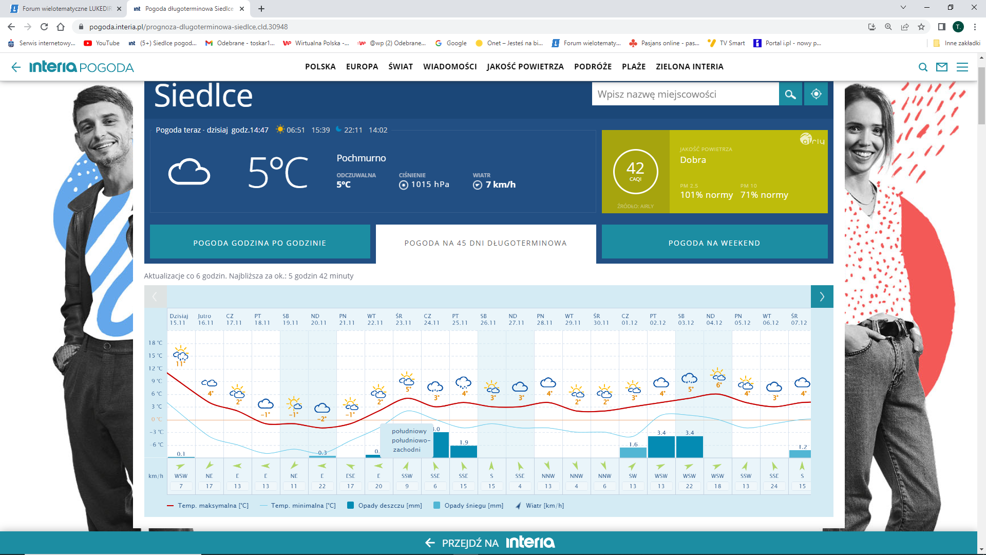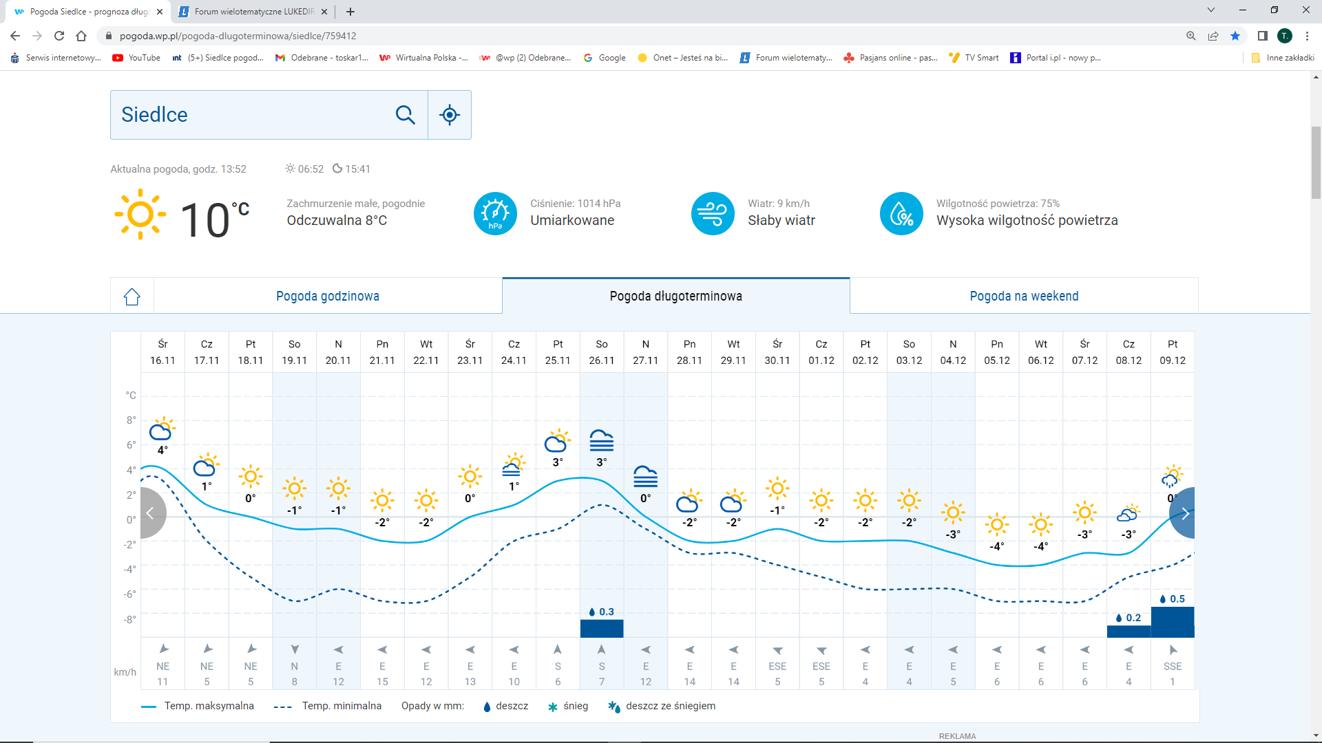 Bartek617 - 15 Listopad 2022, 12:21 Sprawa ochłodzenia jest praktycznie przesądzona, w zasadzie od chyba soboty czy niedzieli (przedwczoraj) trwają przygotowania do stopniowo niższych temp, by zmiany nie były "zbyt bolesne" w odczuciu. Jednak o opady śniegu może w wielu miejscach być trudno. Chwil ze słońcem prawdopodobnie również może okazać się nie za dużo (chyba że w północno-wschodniej ćwiartce Polski) , bo jednak czuję, że zgniły wyż będzie dominował (w południowej Polsce jeszcze nie było takiego dłuższego epizodu, więc rośnie ryzyko jego wystąpienia) i jakość powietrza może się znacznie pogorszyć (z tego zła dobrem mógłby być słabszy wiatr z kierunków wschodnich, bo przy temp. dziennych na poziomie ok. 0 C mógłby w zasadzie być znikomy i słabo odczuwalny [przynajmniej w ciągu dnia]). Ochłodzenie raczej przynajmniej tymczasowo wyzwoli nas od szalejących niżów. Raczej wyczuwam, że będzie uaktywniać się "antyzłośliwość", więc obecny suchy okres minie bardzo prawdopodobnie z ujemną średnią dobową, a ewentualne późniejsze ocieplenie wilgotne może się do tego przyczynić, że noce miną "z plusem". Janekl - 15 Listopad 2022, 13:28 Paweł a zobacz jaka u mnie pogoda nawet trochę zimniej ale za to zero opadów. Nie dość ,że u Was ostatnie dni słoneczne to teraz jak będzie zimniej są u Was opady. A u mnie od tygodnia ciemnica a jak od jutra zimniej to zero opadów a szkoda bo śnieg by chwile potrzymał.