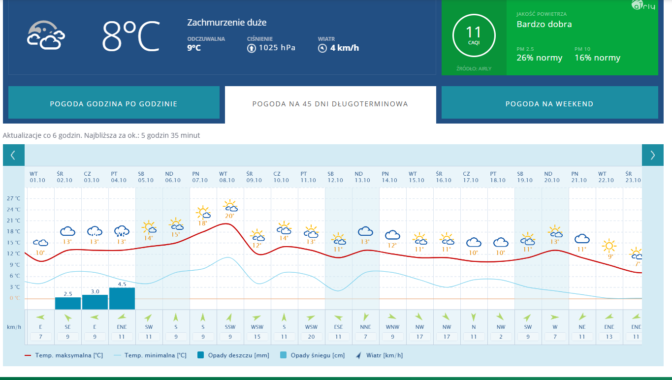 Jednak i tak się dziwię, że ludziom się chce w takich warunkach uprawiać aktywność fizyczną na zewnątrz (jak oczywiście nie mają żadnych zajęć do wykonania na swojej głowie). Dla mnie takie dni, przynajmniej o tej porze roku to doskonały pretekst, by się zaszyć w łóżku lub zażywać długiej ciepłej kąpieli (by nie myśleć z niepokojem o tym, co się za oknem dzieje)... zgryźliwy tetryk - 29 Wrzesień 2024, 21:35 Jeszcze jedna długoterminowa prognoza na październik 2024 roku.