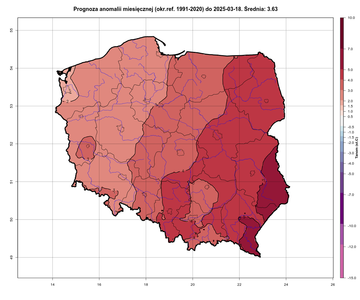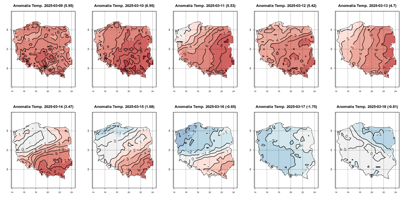 I tu nagle w poniedziałek, z potwierdzeniem we wtorek okazuje się, że doszło wyłącznie do halucynacji modeli. Ochłodzenie wróciło z całą stanowczością i teraz go doświadczamy i to, że nie zasypało nas śniegiem jak 12 lat temu, nie świadczy o żadnej słabości. Być może niektóre stacje zaatakują jeszcze -10 stopni. Ocieplenie też jest trochę odkładane i wcale go nie neguję, ale zauważam,że po raz pierwszy od dłuższego czasu przekonaliśmy się, że nagły atak bordu w prognozach nie musi być wyrokiem i zmiany w modelach nie są drogą jednokierunkową, z której nie da się zawrócić w kierunku chłodniejszym kmroz - 16 Marzec 2025, 21:26 Ja sobie pozwolę jeszcze wkleić prognozę modelu ECMWF z 8.03. A także - dzięki "awarii" meteomodelu wciąż widoczna na zakładce "bieżący miesiąc" - prognoza anomalii z kolejnego dnia, niedzieli 9.03