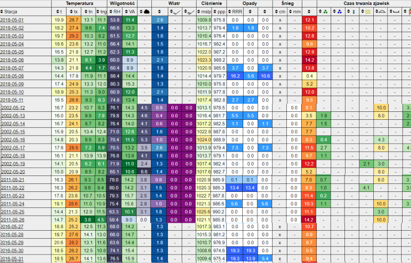 Nie widać burz z 8 i 11 maja 2018, a także 30 maja 2016 - niestety od 2015 roku stacja ich nie raportuje.