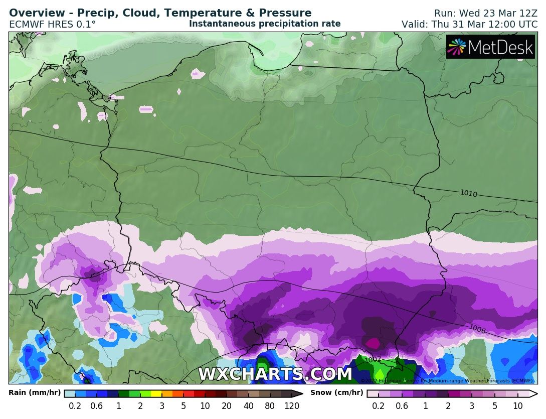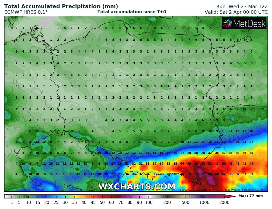 Na dane pokrywy to w tym modelu nie ma co patrzeć, ale wkleję sumę opadów - niemal wszystko z tego na południu, to dni 31.03-1.04