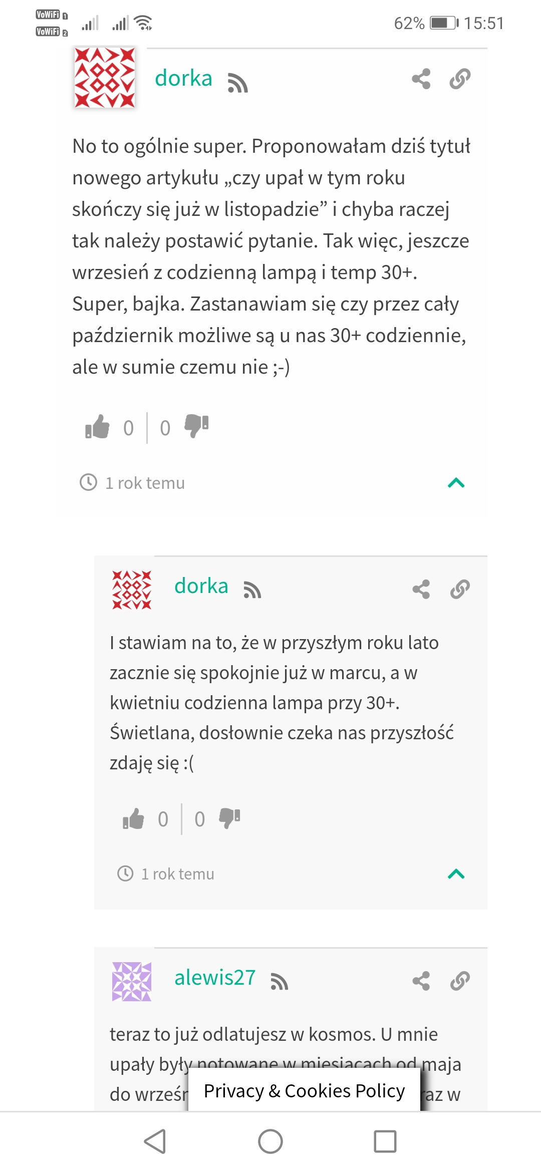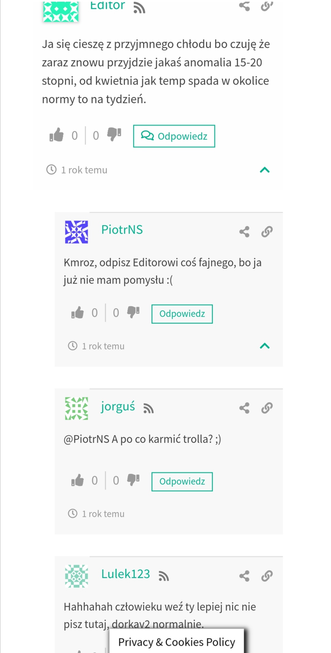 A pani z Bródna dała mi wtedy kosza, bo nie odpisała Z tego co pamiętam, kawałek pod moim komentarzem odezwał się fioletowy pan z Kujaw albo szary pan z Podlasia, który narzekał na zimno w Polsce i pisał coś o Hiszpanii. Dopiero wtedy nadeszła standardowa odpowiedź, tysięczny komentarz o tym, że polscy Murzyni (xD) kochają upały jak żaden inny naród i choćby klimat ocieplał się nie wiadomo jak, to zawsze będzie im za zimno, a dla niej to jest nie do życia