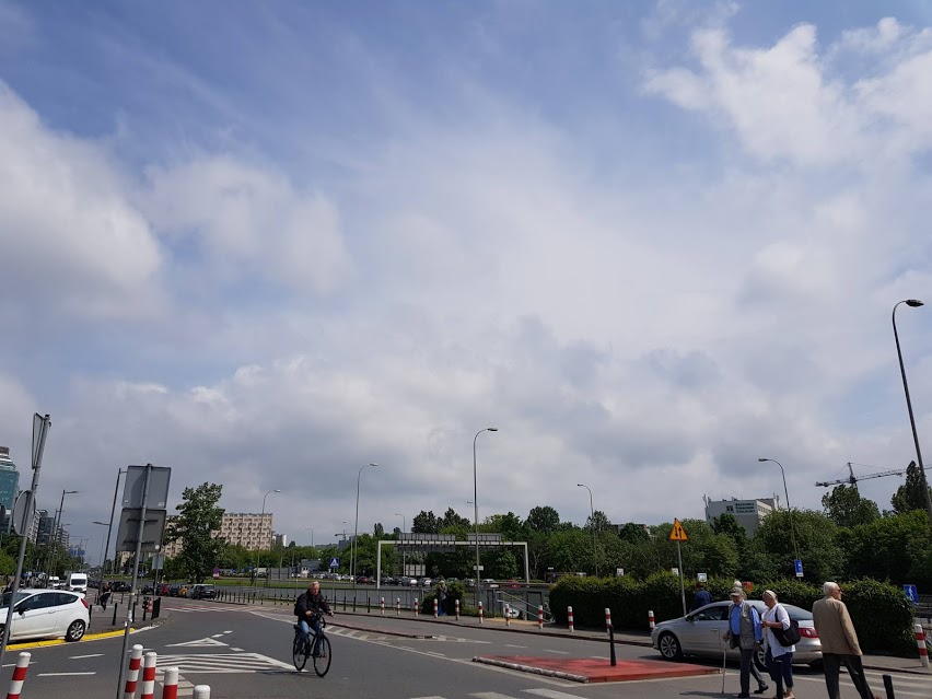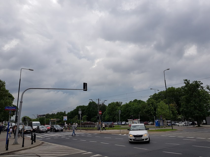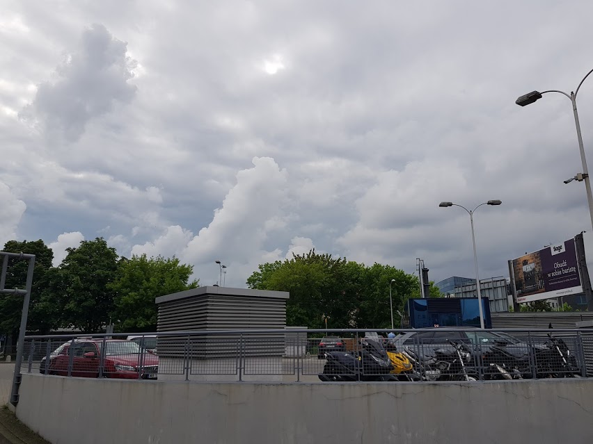 Około godziny 11:00 wybrałem się do biblioteki na Terenie Południowym Politechniki Warszawskiej. Temperatura właśnie wtedy wzrosła do dobowego maksimum, około 20 stopni.Gdy stamtąd wychodziłem, niebo było już ciemne, pełne konwekcyjnych chmur:
