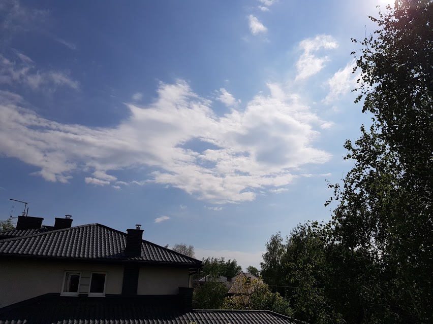 Noc poprzedzająca ten dzień była ciepła, temperatura spadła do 11-12 stopni. Poranek przyniósł niewielkie rozpogodzenia - mój region znalazł sięna granicy strefy grubych chmur: