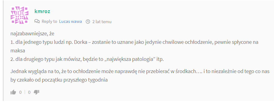 Najgorsze jest to, że częściowo mieli rację, bo dla osób lubiących słoneczną pogodę kwiecień 2020 był niewątpliwie ładny i termicznie mimo że amplitudowy, to pod kątem średniej dobowej był formalnie wiosenny (1-2, góra 3 dni nie zmieściły się niestety w przedziale 5-15 C, na szczęście były to przypadki pogodne i bezopadowe). Z tym ustąpieniem opadów śniegu to jest jednak nadużycie (bo ja od bodajże 29-30.03.2020 nie widziałem u siebie w ogóle tego typu opadu, opad z 14.04. mi wyglądał na krupę lub mżawkę). O ustąpieniu opadów śniegu może być mowa teraz, w obecnej porze chłodnej, a w tamtym sezonie, to sukcesem było, jak trawka zmieniła kolor z zielonej na białą, nie mówiąc o pokrywie śnieżnej, która praktycznie była przez prawie cały czas zerowa. Maj mimo że był chłodny i słotny (względnie często padało, ale to nie była sytuacja jak w 2010 czy w 2019, że tu rzeczywiście kropelki leciały z nieba prawie codziennie), to jednak zawierał w sobie jakieś ładne dni- to był dobry przykład miesiąca (tak jak kwiecień), w którym aura była naprawdę niezła na tle anomalii termicznej. Burz codziennie na pewno nie było, choć pamiętam, jak pojawiały się dość często prognozy związane z zagrożeniami takimi zjawiskami atmosferycznymi od czasów Majówki. Pod kątem aury nie dostrzegłem większej różnicy między 1 a 2 połową, najwięcej pogodnego nieba było mniej więcej na ich pograniczu. Gorąco jakoś nie było, ale w 1 niedzielę pamiętam, że podczas Mszy zrobiło mi się trochę słabo (stałem na zewnątrz, bo dużo osób paradoksalnie było w środku), jak temp. wynosiła koło +25 C, a niebo było dość pochmurne, to był chyba dzień 10.05.2020 (przed konkretniejszym ochłodzeniem). Jacob - 14 Luty 2021, 13:44 Niestety to nie jedyny portal propagujący żywioł ognia Bartek617 - 14 Luty 2021, 14:04 A jakie są jeszcze strony (poza Twojąpogodą), które faworyzują słoneczną i ciepłą aurę?