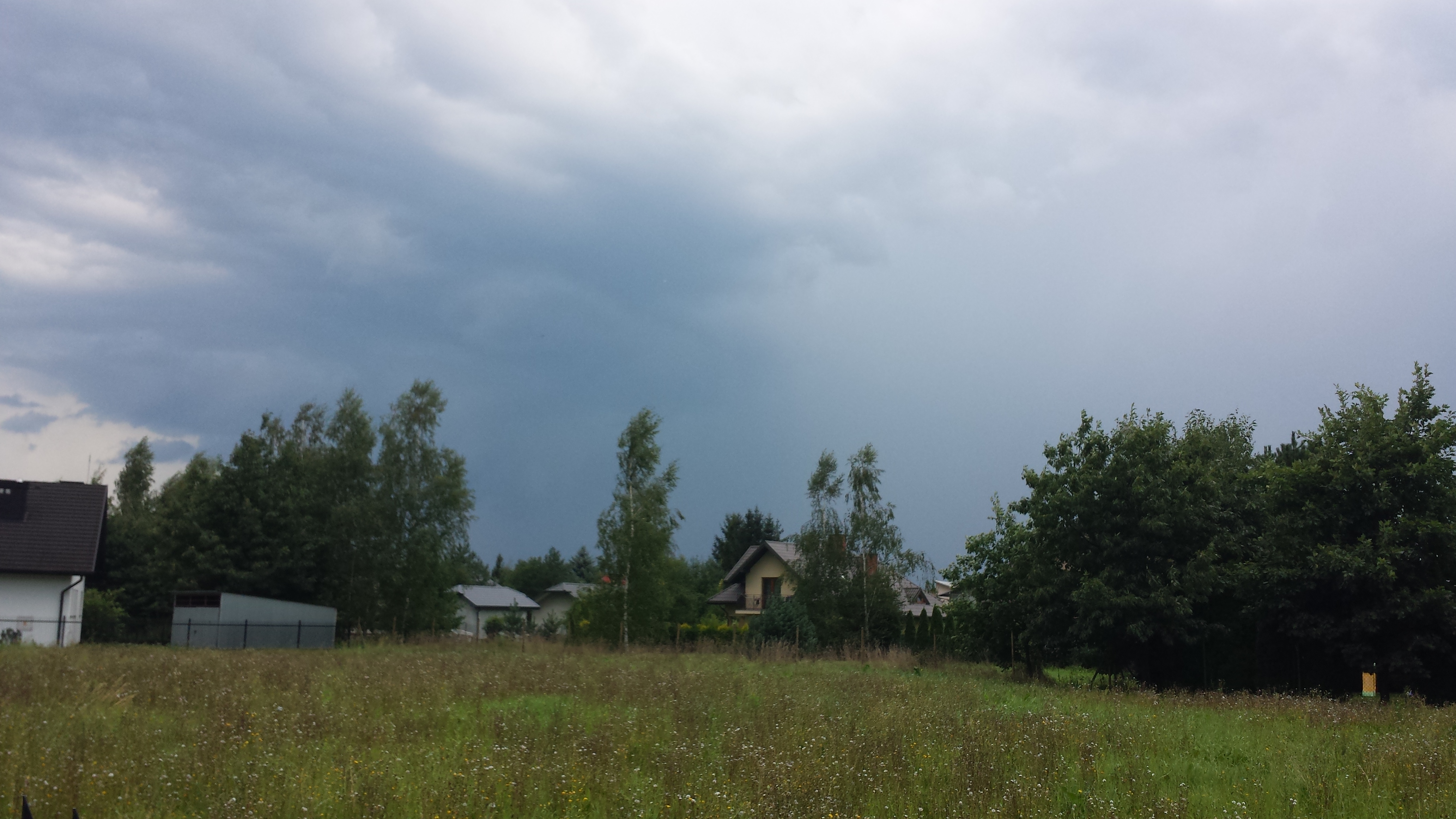 W 2011 roku przed 16:00 poszliśmy do wujka na grilla i oczywiście po chwili zaczęło grzmieć. Kiedy tylko to usłyszałem, wyszedłem na drogę zrobić rozpoznanie, po czym wróciłem i oznajmiłem wszystkim, żeby zabierać się do domu, bo za chwilę będzie burza i może mocno padać. Widziałem bowiem po chmurach, że ewidentnie zbiera się na duży deszcz. Dorośli, jak również kuzynostwo (także dorosłe) zbytnio się tym nie przejęli i dopiero po chwili chrzestny powiedział coś w stylu "nie chcę być złym wróżem, ale chyba faktycznie za chwilę się rozpada". Na szczęście burza szła stopniowo i zaczęła się od drobnej mżawki, co dało wszystkim czas na schowanie się do domu. Ja poszedłem do swojego domu, miałem blisko. Po drodze widziałem, że w chmurze tworzy się słaby szelf, a za nim jest pociemnienie charakterystyczne dla burz gradowych. Na mojej łące przed domem, jak niemal codziennie w lecie 2011 roku, koledzy i koleżanki z sąsiedztwa grali w piłkę. Przyszli po mnie, bym zagrał z nimi, ale akurat nie było mnie wtedy w domu i nie wiedzieli dokąd poszedłem. Z lekkim wyrzutem odpowiedziałem że mogli zadzwonić, po czym ostrzegłem ich przed nadchodzącą burzą, na co odpowiedzieli że wiedzą, tylko chcą dokończyć mecz. Ja w każdym razie poszedłem już do domu i tylko przez okno na górze obserwowałem, jak mały szelf naciera nade mnie i zaczyna padać deszcz. Chyba nie dokończyli grać, bo uciekali w popłochu Błyskawice uderzały bardziej na wschód i widziałem ich niewiele, lecz w pewnym momencie zwróciłem uwagę na jakby białą mgłę (bardzo ostry cień mgły) przykrywającą oddalone o około kilometr drzewa i zrywający się tam silny wiatr. Mgła przybliżała się i w końcu nadeszła, a wtedy dowiedziałem się, co oznaczała. Po raz kolejny w tym roku sypnęło gradem. Na szczęście niezbyt mocno, ale to kolejna burza, której nadałem miano nawałnicy. Spadło 15 mm deszczu; to bardzo mało przy 45 milimetrach rok wcześniej, ale i tak wartość godna pochwały