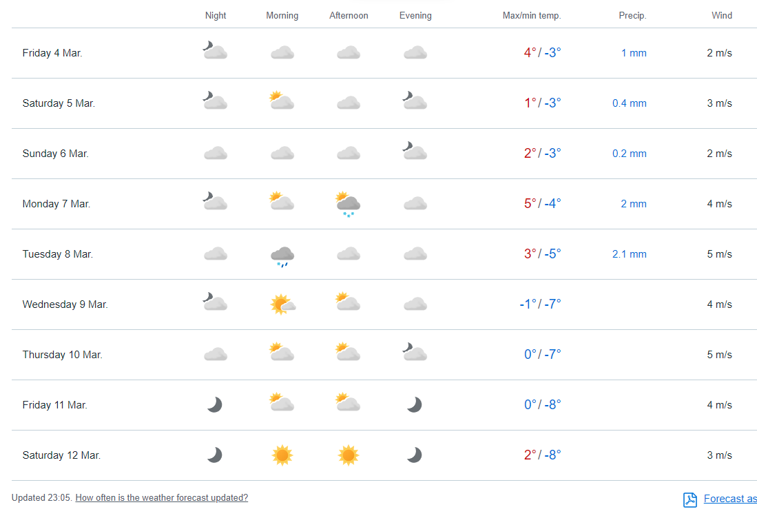 FKP - 3 Marzec 2022, 23:49 kmroz, Luj ci w mleczną.Bartek617 - 4 Marzec 2022, 10:03 Nie ukrywam, wolałbym by obecna pogoda miała miejsce miesiąc temu (wtedy była odwrotna sytuacja: pokrywa śnieżna utrzymywała się miejscami w ramach "dziedzictwa", ale też temp. były wyższe i bardziej opad ciekły lub mieszany padał niż stały- inny układ baryczny o takim aspekcie zadecydował), ale w sumie myślę sobie, że dobrze, że się taki wilgotny chłód teraz pojawia (bo w zasadzie jest to obecnie naturalna sytuacja, by temp. była góra kilka C powyżej 0), niż za miesiąc. pawel - 4 Marzec 2022, 10:41 Bardzo mroźnego stycznia ciąg dalszy kmroz - 4 Marzec 2022, 10:52 Nawet na Kasprowym tak mroźno nie będzie, nie wiem co ten yr.no w tej Kasinie odwala, chyba ma ślepotę śnieżną i to taką zaawansowaną.pawel - 4 Marzec 2022, 11:03 Ta sama ślepota wypluwała w lutym ub.r. pobicie rekordu z 1929 kmroz - 4 Marzec 2022, 15:53 Dzisiaj wyjątkowo długo trzeba było czekać na aktualkę na yr.no (ECMWF był już gotowy jak zawsze o 8:00).