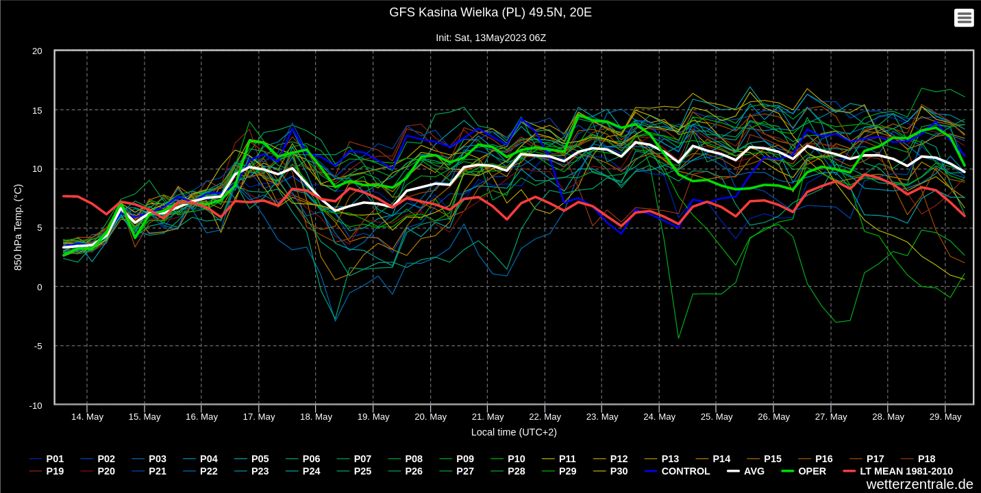 Ochłodzenia są naturalną koleją rzeczy podobnie jak ocieplenia: czy je lubimy czy nie, trzeba się jakoś z ich obecnością pogodzić. PiotrNS - 13 Maj 2023, 00:11 Prognozy są nadal niejednoznaczne, ale z uśrednienia wynika, że przynajmniej ja nie mam szczególnie dużych powodów do niepokoju. Jeśli się ochłodzi, to raczej na krótko, przy ociepleniu mam szansę na w końcu sensowne noce i burze, a przy tym wszystkim popada, na czym już coraz bardziej mi zależy.kmroz - 13 Maj 2023, 01:02 PiotrNS, same opady mam głęboko w bogatkach, bardziej mi zależy na parnym powietrzu, ludzkim punkcie rosy, ciepłych nocach i burzachkmroz - 13 Maj 2023, 01:13 Modele sobie tańcują i przeciągają linę, spójrzmy więc na prognozy z tej strony, mniej więcej stabilne i bardzo skuteczne w ostatnim czasie Dopiero jak tutaj zacznie pokazywać się bardziej patolskie zimno, to zacznę się realnie przejmować. Na razie widać, że trochę patoli może koło 18.05 się pojawić, ale bez wielkiego dramatu