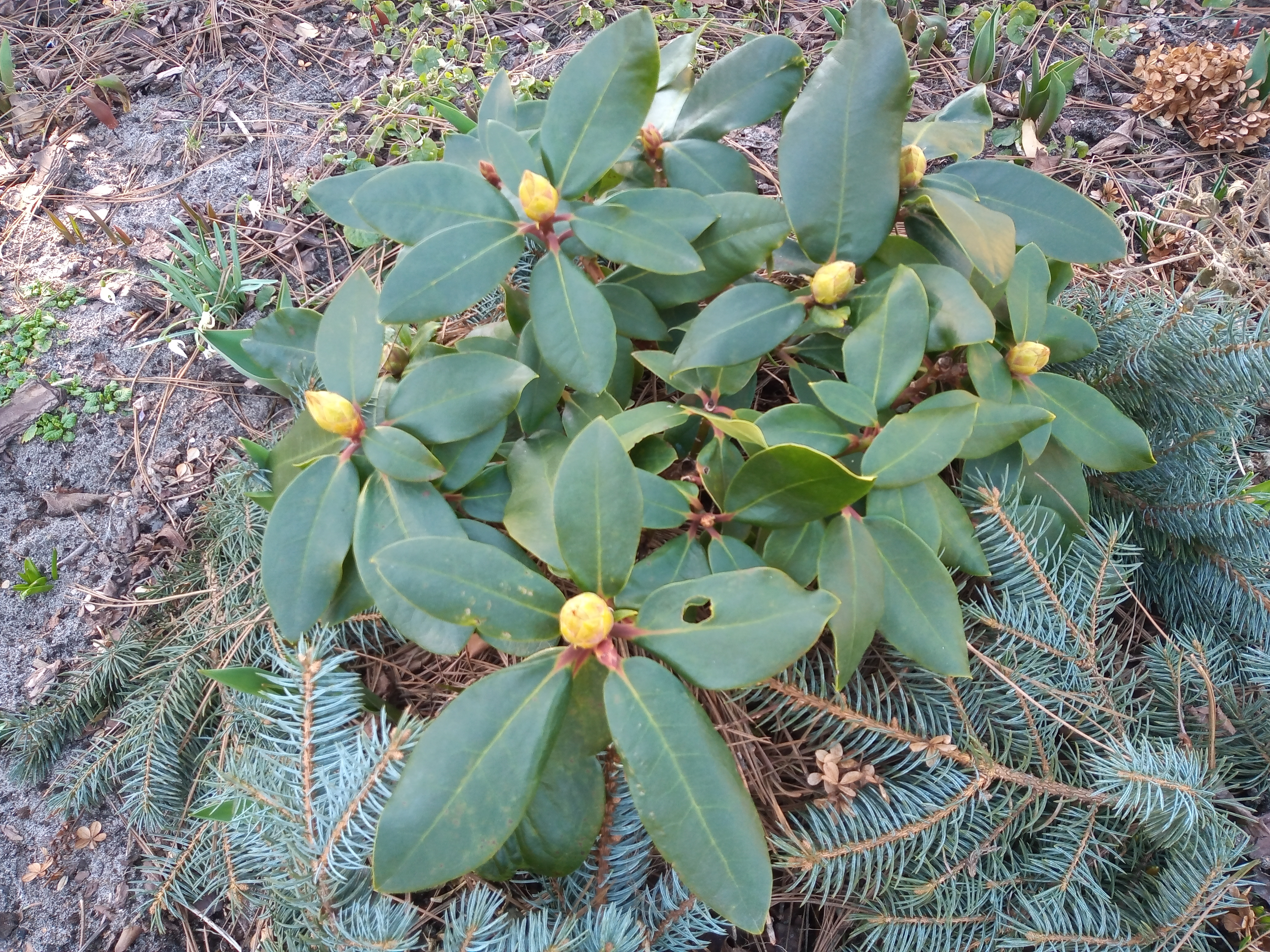 Jednak rododendron w osłonce ze świerkowych gałązek przetrwał zimę. Inna rzecz, że nie była ona zbyt sroga.