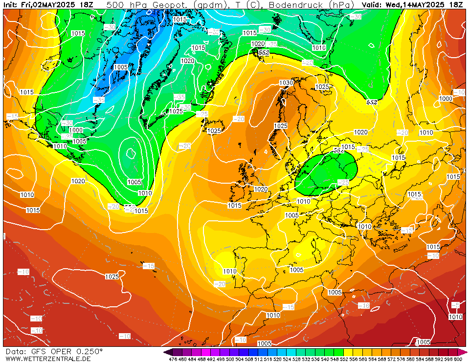 No to niektórzy mają takie oczekiwania jakie ja miałem jako 10-latek, gdy tylko lubiłem wysokie temp. (rzecz jasna dzienne, nocami wolałem niskie). 20-23 C jako "minimum" (a właściwie maksimum, bo chodzi o najwyższą odnotowaną temp. w ciągu dnia) w ciągu dnia jest dobre w zasadzie od ok. 15-20 czerwca do ok. 10-15 września, wcześniej i później takie temp. wybiegają poza średnią, tj. 50 percentyl (w takim maju to gdzieś 60-80 [wiadomo im bliżej końca, tym większa jest to jednak norma, w okolicach dnia Matki np. mało kto raczej chce +10 C w południe i przymrozków w nocy, od tego jest przecież już bardziej Wielkanoc, Majówka i Ogrodnicy] , w październiku również koło 70-80, a w kwietniu ok. 80-90). LukeDiRT - 3 Maj 2025, 10:23 Kółko obniżonego geopotencjału akurat nad Polską...