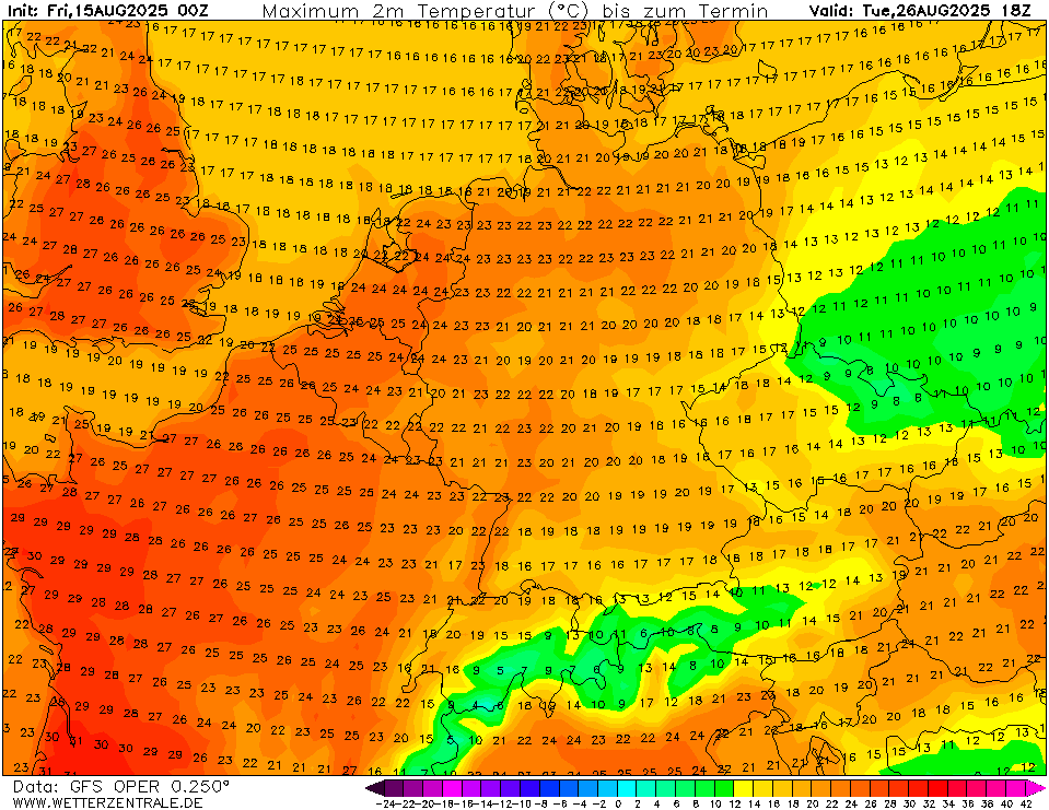 Bartek617 - 23 Sierpień 2025, 20:34 Nie sprawdzi się raczej- jak u nas w prognozach widać na pierwsze dni września za dnia "tradycyjnie" po ok. 20/22 C (jak Bozia da szczęście to może miejscami nieco więcej), to na wschód od nas może termometry wskażą koło +25 C przy dobrych wiatrach Nie wiem co prawda jaka cyrkulacja się szykuje, ale na chwilę obecną przynajmniej nie zapowiada się raczej na ulewne deszcze (co innego parogodzinne kapuśniaki czy adwekcyjne burze), a wówczas ten gorąc na terenie Białorusi czy Ukrainy (nie licząc regionów z innej strefy klimatycznej, a więc wybrzeża Morza Czarnego oraz Azowskiego i Półwyspu Krymskiego) wydaje się nie na miejscu FKK - 24 Sierpień 2025, 10:18 15 stopni na Kaszubach, 39 stopni przy trójstyku polsko-białorusko-ukraińskim. Przegięcie w obie strony, nie będzie to miły dzień dla Janka i Tetryka. A gdyby była średnia z tych 2 wartości, czyli 27 stopni, to wszyscy byli by zadowoleni. Przyjemne gorąco, ale bez przegięcia.Bartek617 - 24 Sierpień 2025, 11:20 Taka rewelacja ma tyle z prawdy co twierdzenie, że np. tegoroczne wakacje są prawdziwie gorące/upalne i słoneczne- z tymże tutaj wybiegamy w przyszłość, więc to tylko jedna z hipotez, w dodatku pochodzących z ogólnodostępnych rozdań modelowych, a zatem często zawierających skrajne wyliczenia dotyczące temp. powietrza lub opadów Tyle można powiedzieć, że w popołudnie 3 września rozkład izoterm prawdopodobnie będzie inaczej się przedstawiał i że taki wyraźny kontrast termiczny najpewniej nie wystąpi