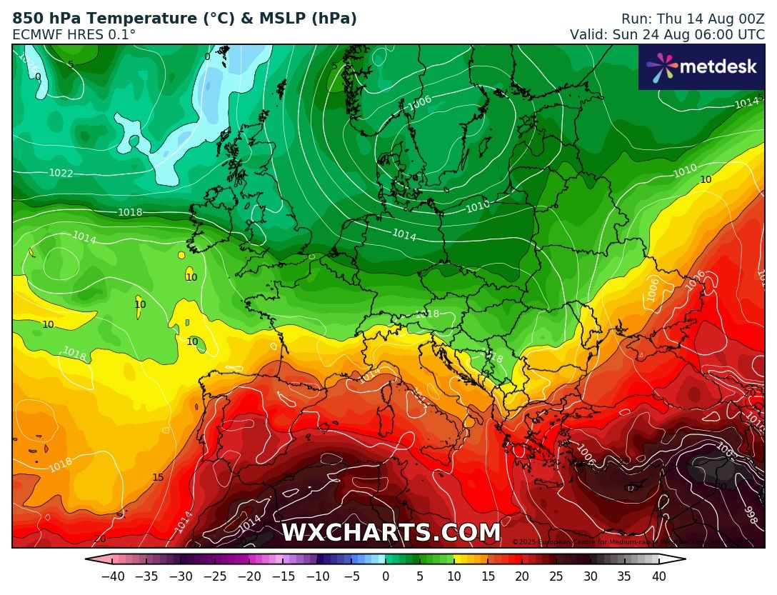 Najprawdopodobniej na niżej położonych obszarach na linii równoleżników ok. 50-60 N (niezależnie czy na zachód czy na wschód Europy idąc) nawet trudno będzie raczej o gorąc (tj. osiągnięcie lub przekroczenie +25 C), zważywszy na okoliczność, że to są okolice rozpoczęcia roku szkolnego Jakiś kapuśniak czy niewielka burza jest bardziej prawdopodobna niż regularna lampa osuszająca powietrze nieprzerwanie na całą dobę i uwalniająca temp. powietrza za dnia, noce jeszcze jakiś tam poziom mają raczej trzymać (nie mniej niż ok. 10-12 C) Janekl - 24 Sierpień 2025, 13:37 W lipcu w północnej Finlandii było wiele dni gdzie tam było cieplej o ponad 10 stopni niż w południowej Finlandii a dlaczego tego nie ma w Polsce dlaczego u mnie nie ma o ponad 10 stopni cieplej jak Krakowie?.FKP - 24 Sierpień 2025, 14:11 Janekl, Bo taki był układ baryczny.