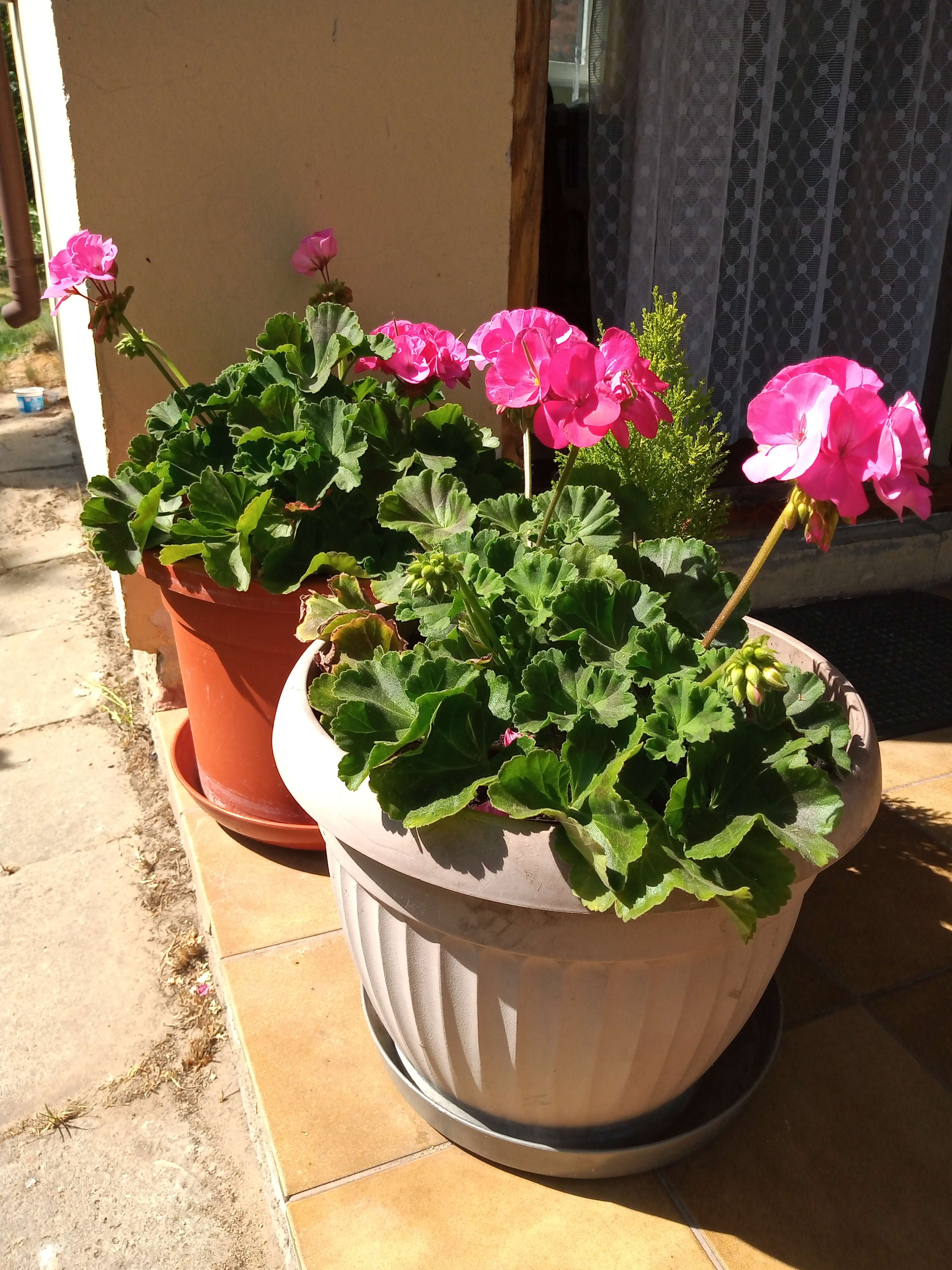 Pelargonie w donicach.