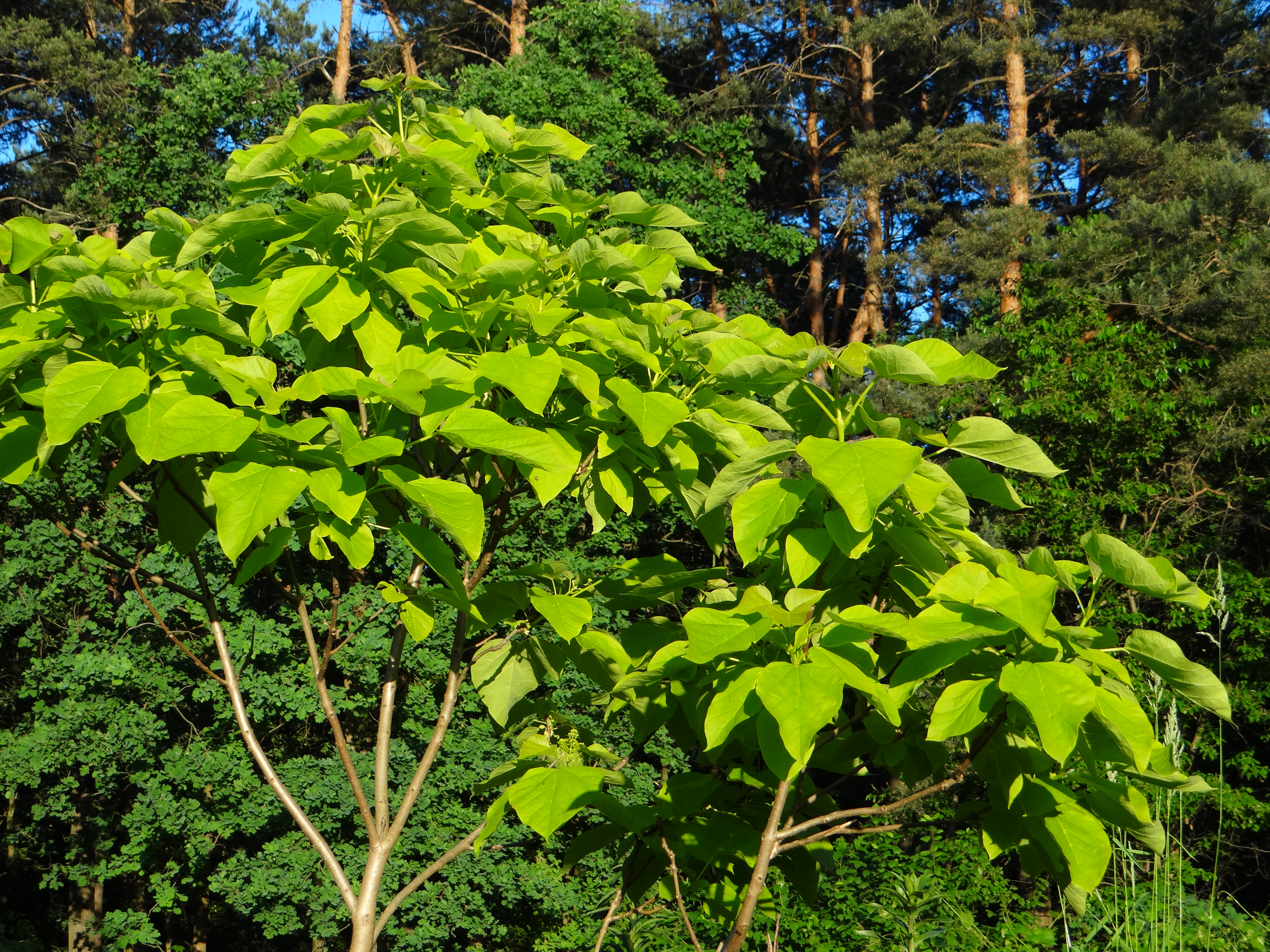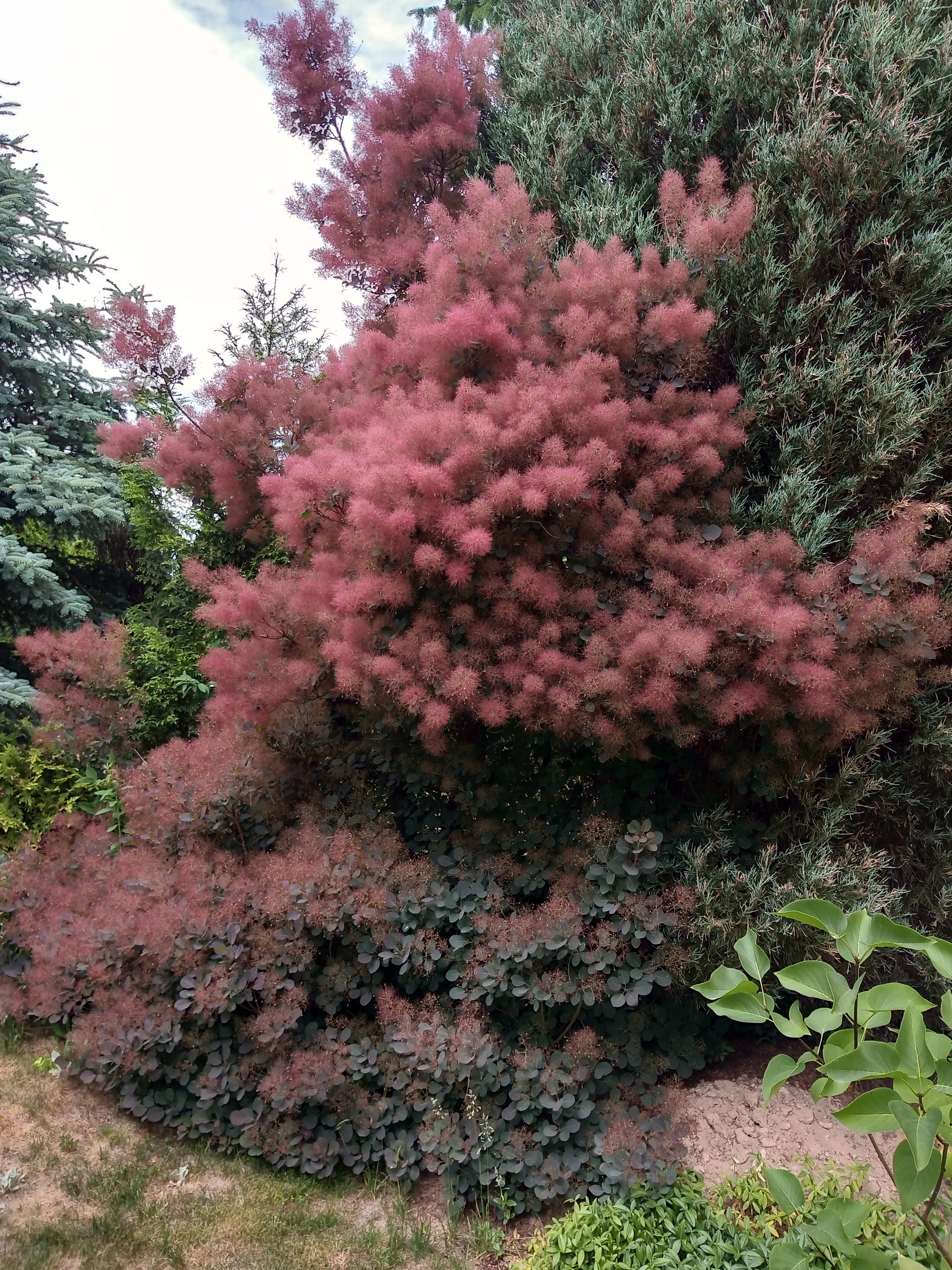 Perukowiec w pełni rozkwitu. Liści wczesną wiosną czerwone, obecnie przybarwiły się na zielone. potem będą brązowieć. Taka zmienność to cały jego urok.