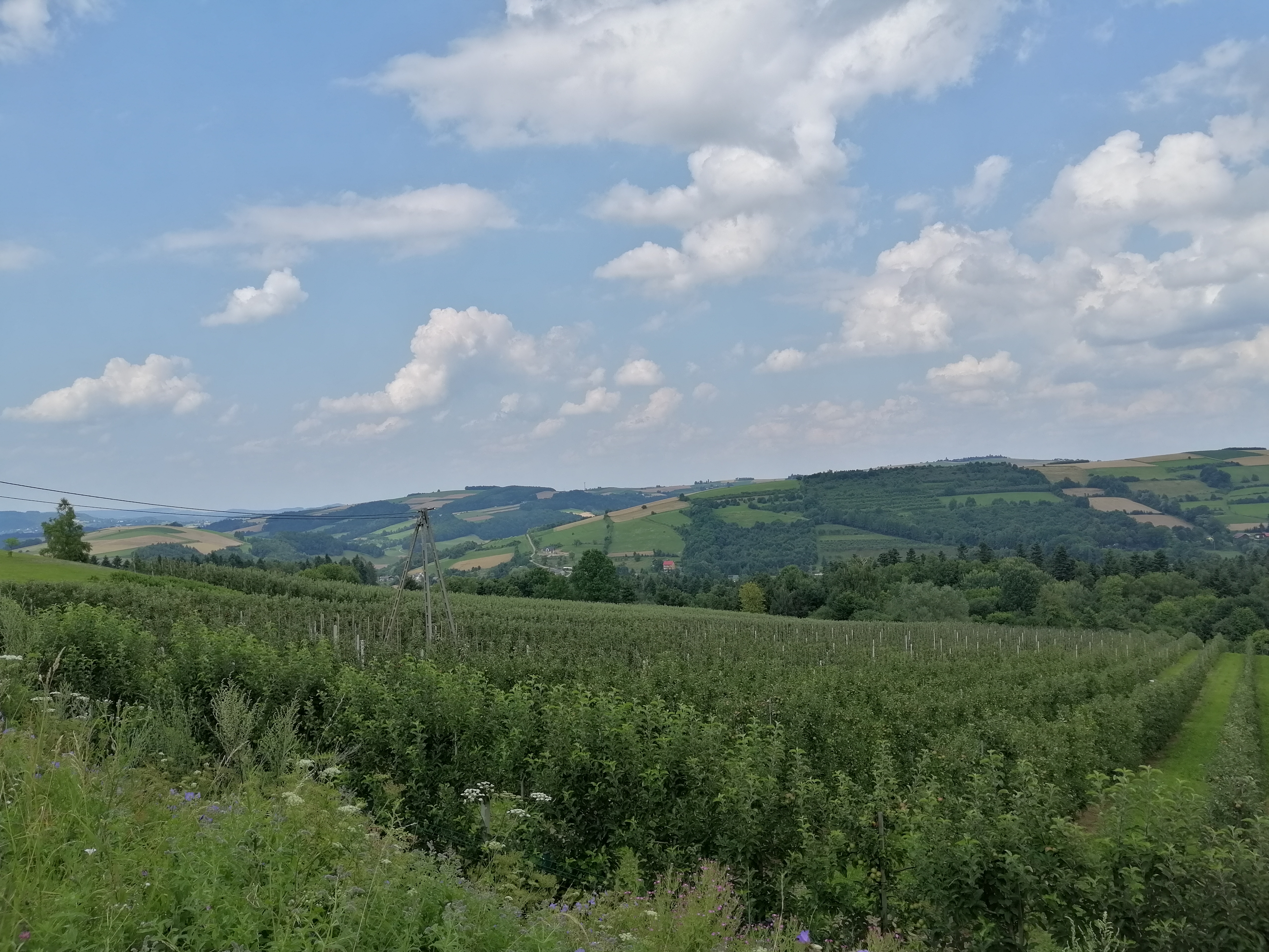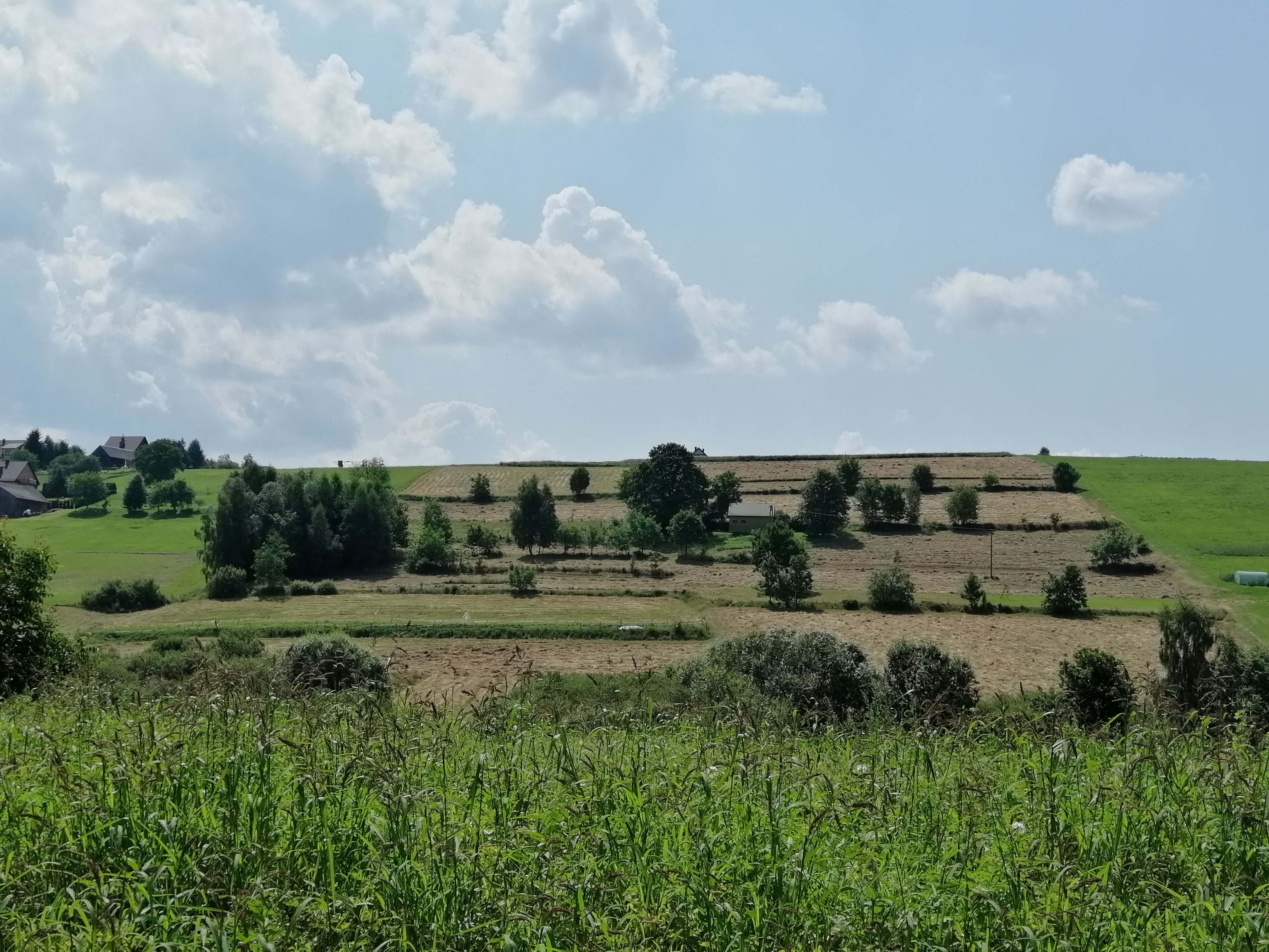 Dość sprawnie przedostawałem się dalej, tam gdzie już dosyć rzadko się zapuszczam. Krajobraz stawał się coraz bardziej wiejski i górzysty, a pagórki wymuszały na mnie częste zjazdy przeplatane kolejnymi podjazdami. Urzekły mnie te pola widoczne na zdjęciach.