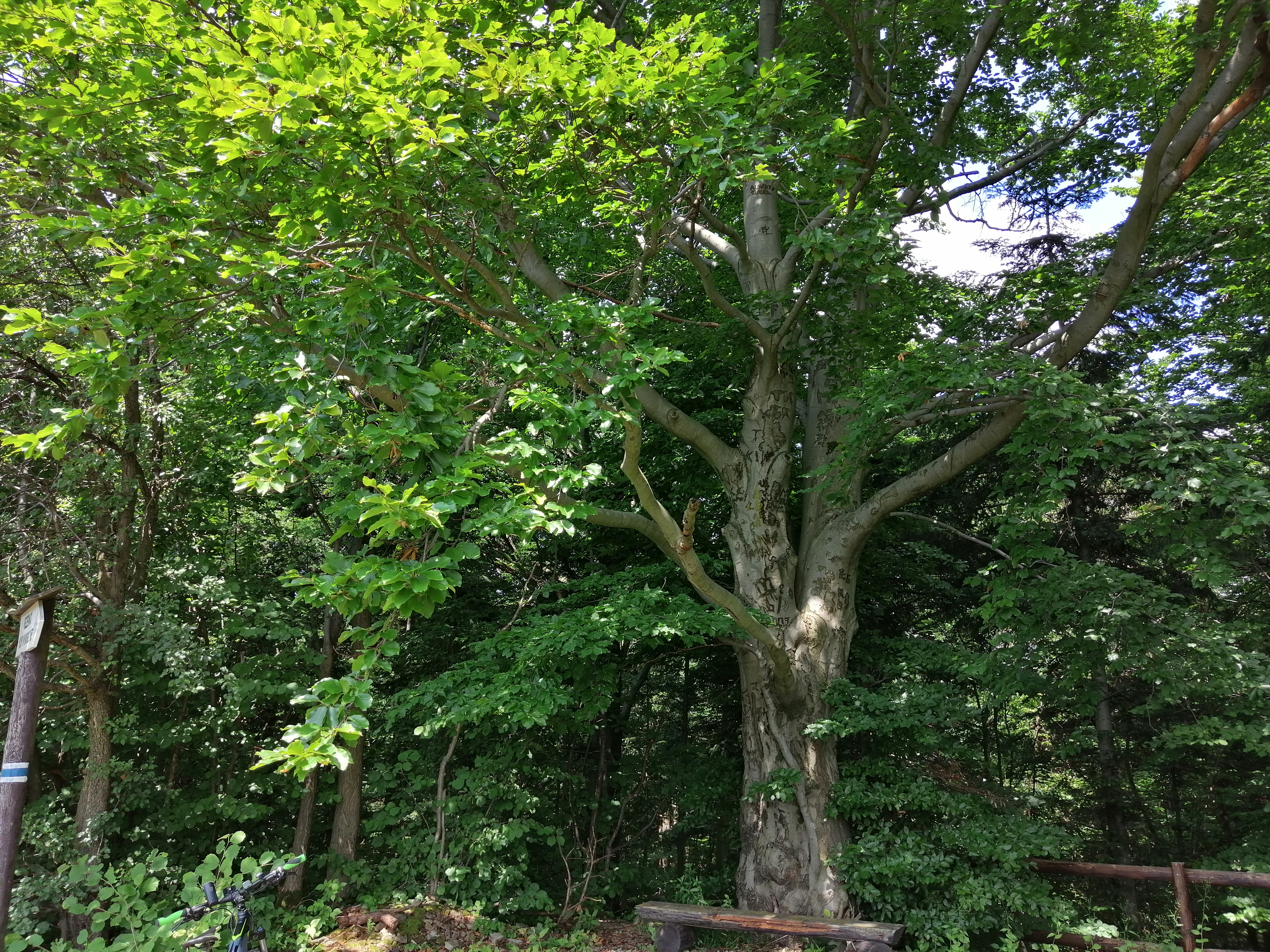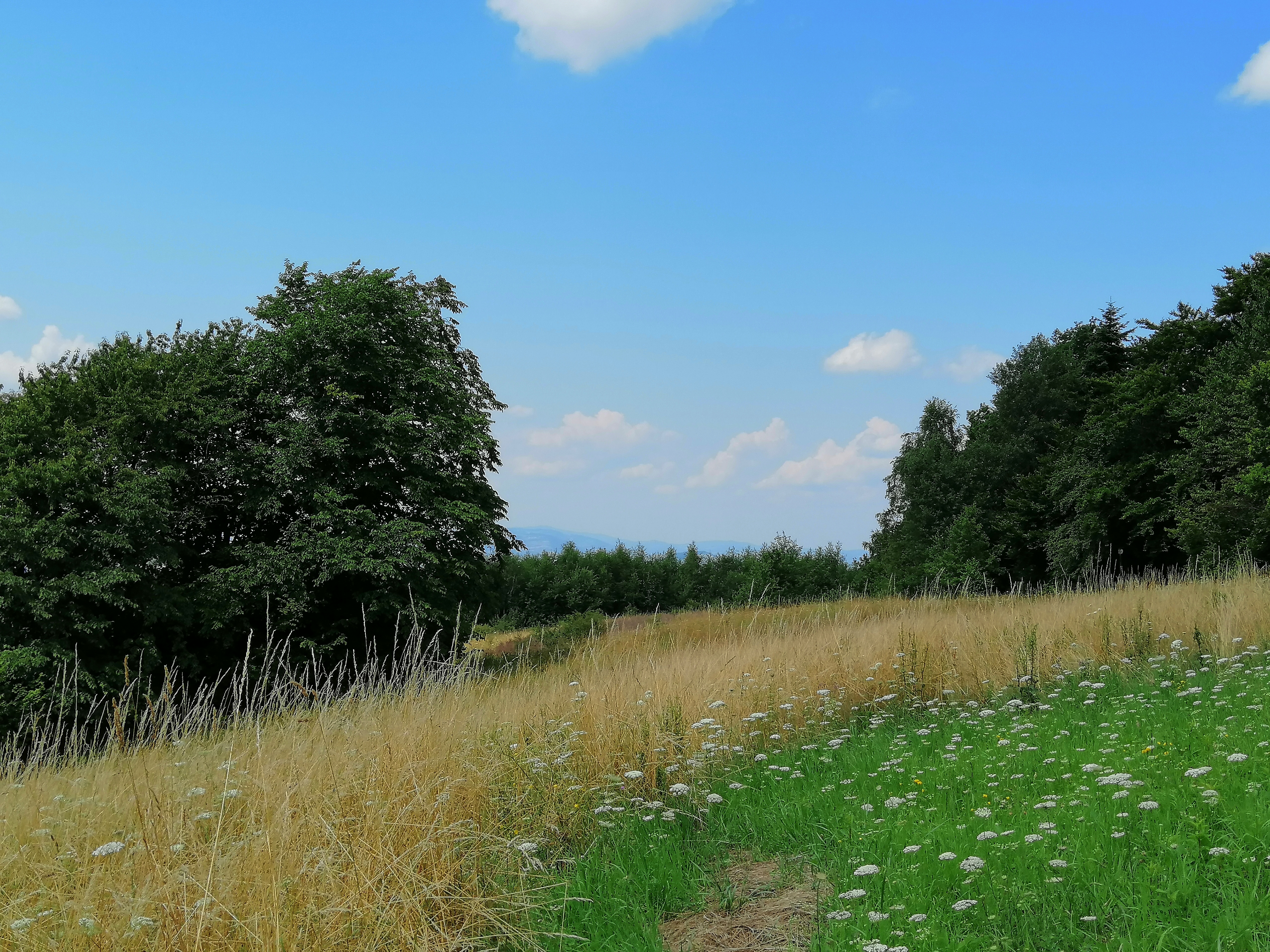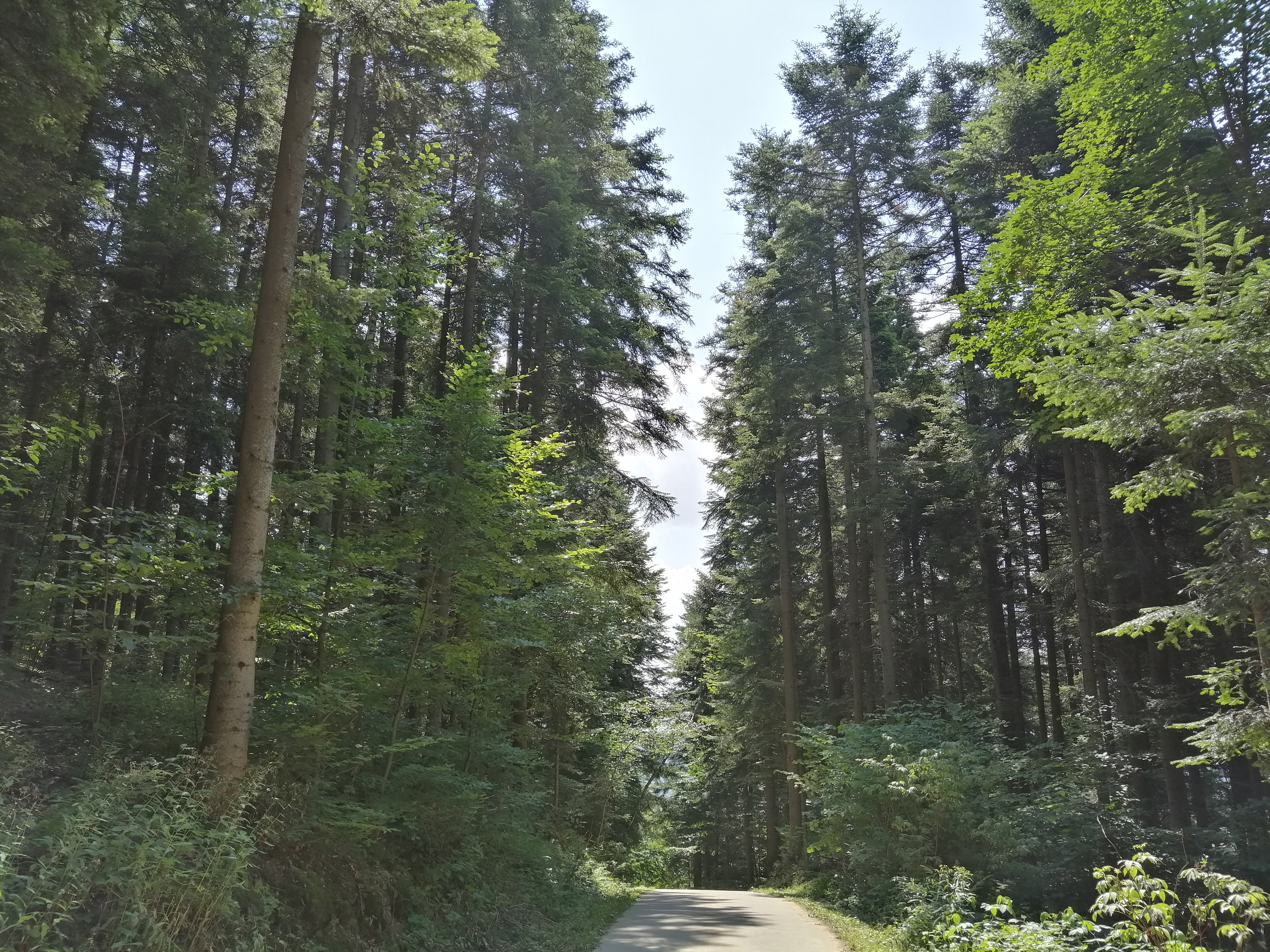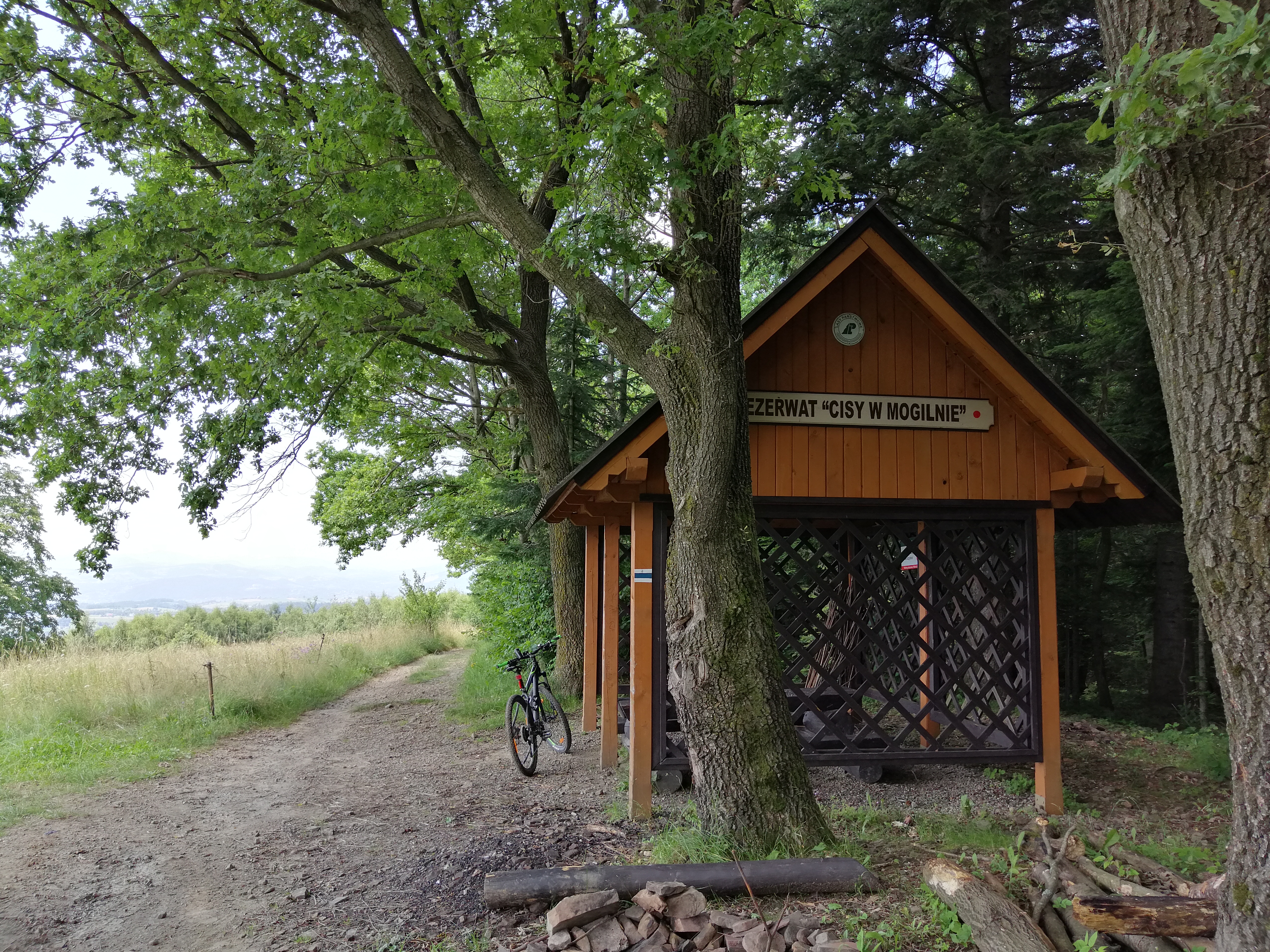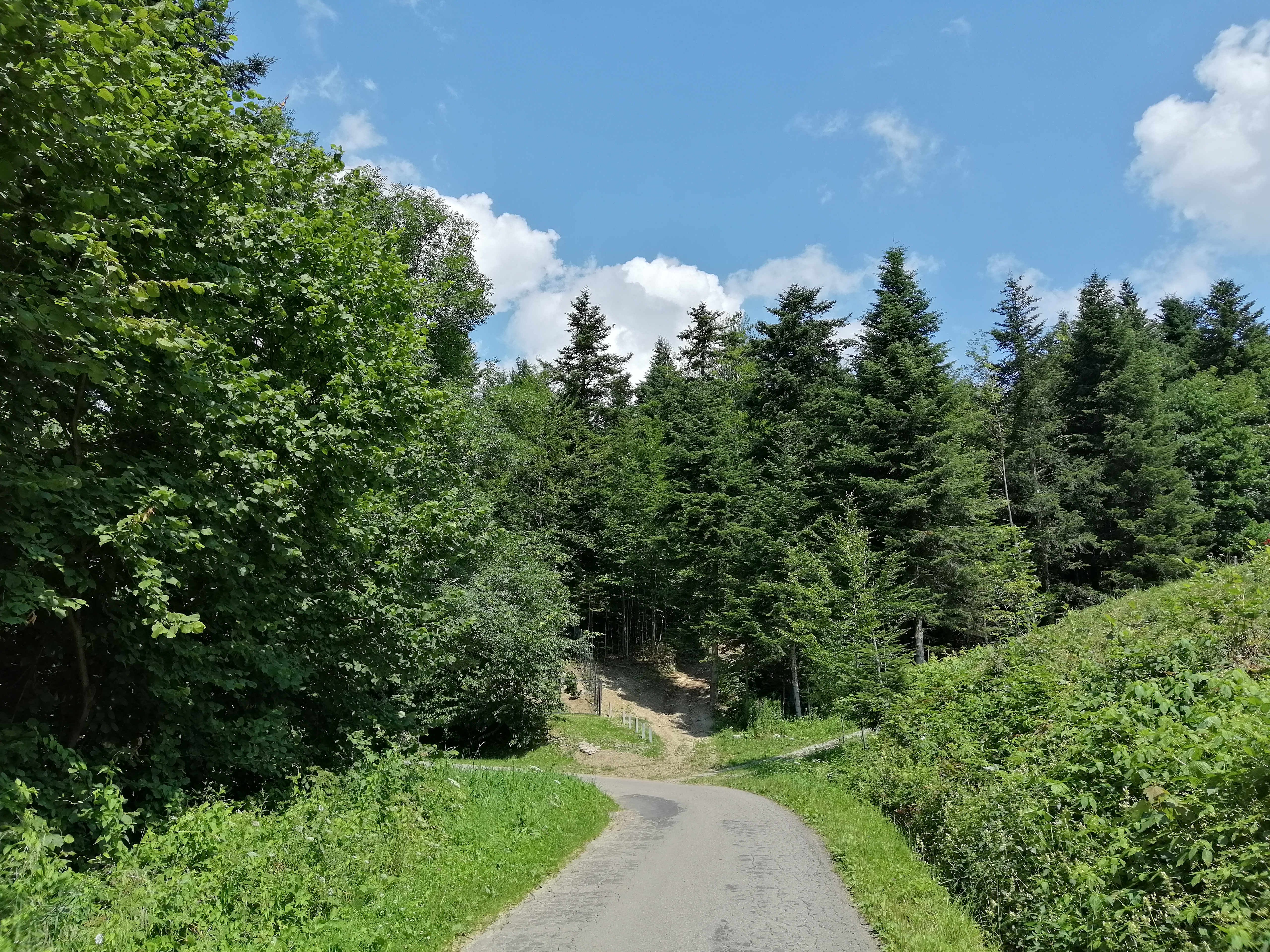 Po jakimś czasie musiałem na chwilę poprowadzić rower, ponieważ górska droga okazała się stroma, a ponadto zbyt grząska po ostatnich opadach. Po około 10 minutach dotarłem już do polany na górze, obok rezerwatu cisów.