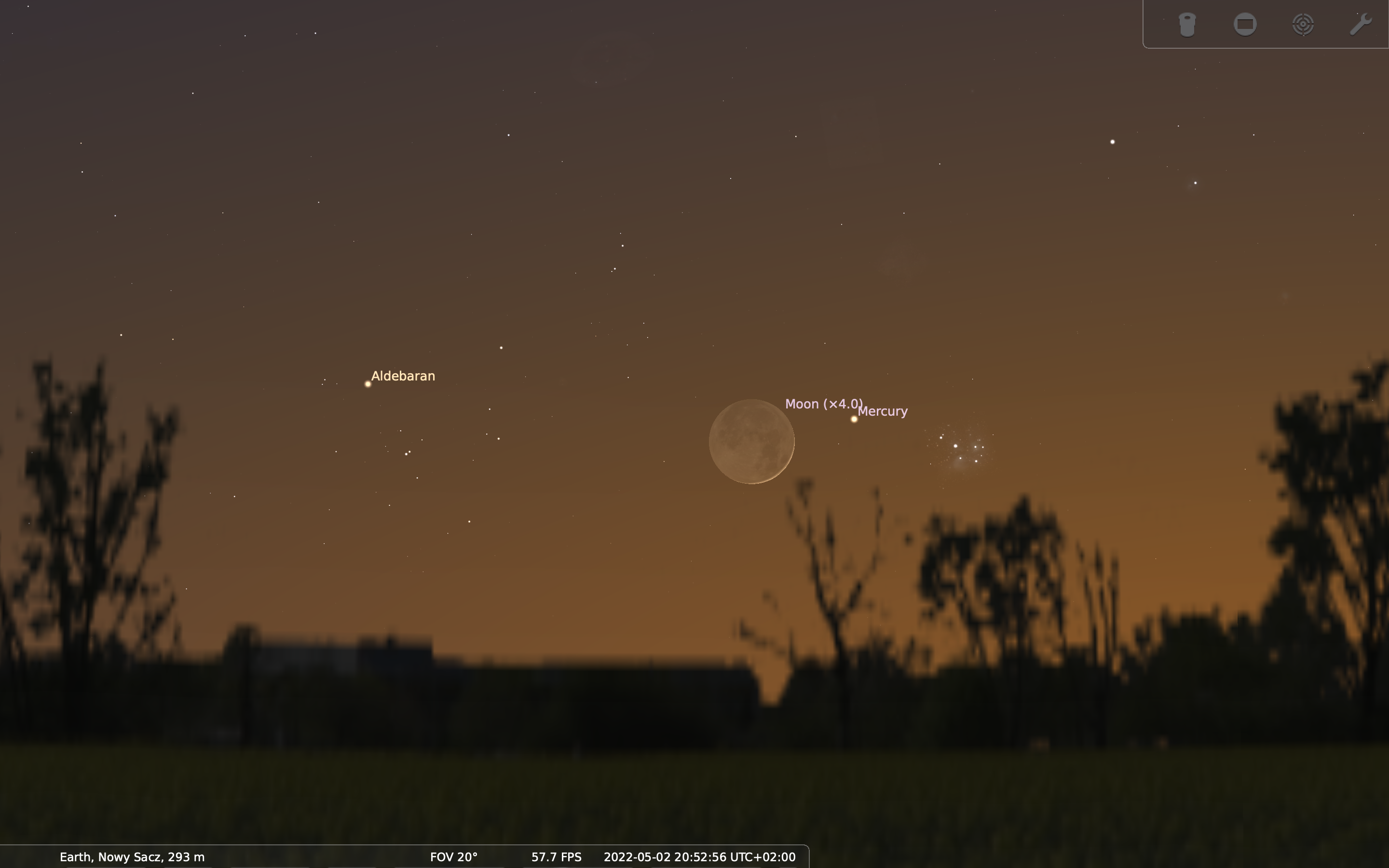 2 maja wieczorem wyjątkowo uroczy widok pokaże się nisko nad zachodnim horyzontem. Wkrótce po zachodzie Słońca będziemy mogli zaobserwować tam rzadko widywanego Merkurego, a zaraz obok wąski sierp Księżyca wkrótce po nowiu, obok którego widnieć będą zachodzące Plejady - słynna, jasna gromada gwiazd w konstelacji Byka. Po drugiej stronie Księżyca świecić będzie Aldebaran - najjaśniejsza gwiazda tego gwiazdozbioru. Niestety z uwagi na bliskość Słońca, całość tego spotkania widoczna będzie tylko wkrótce po zachodzie Słońca (maksymalnie do 21:00) i nisko nad horyzontem. Przed obserwacją należy znaleźć miejsce z jak najbardziej odsłoniętym zachodnim widnokręgiem.