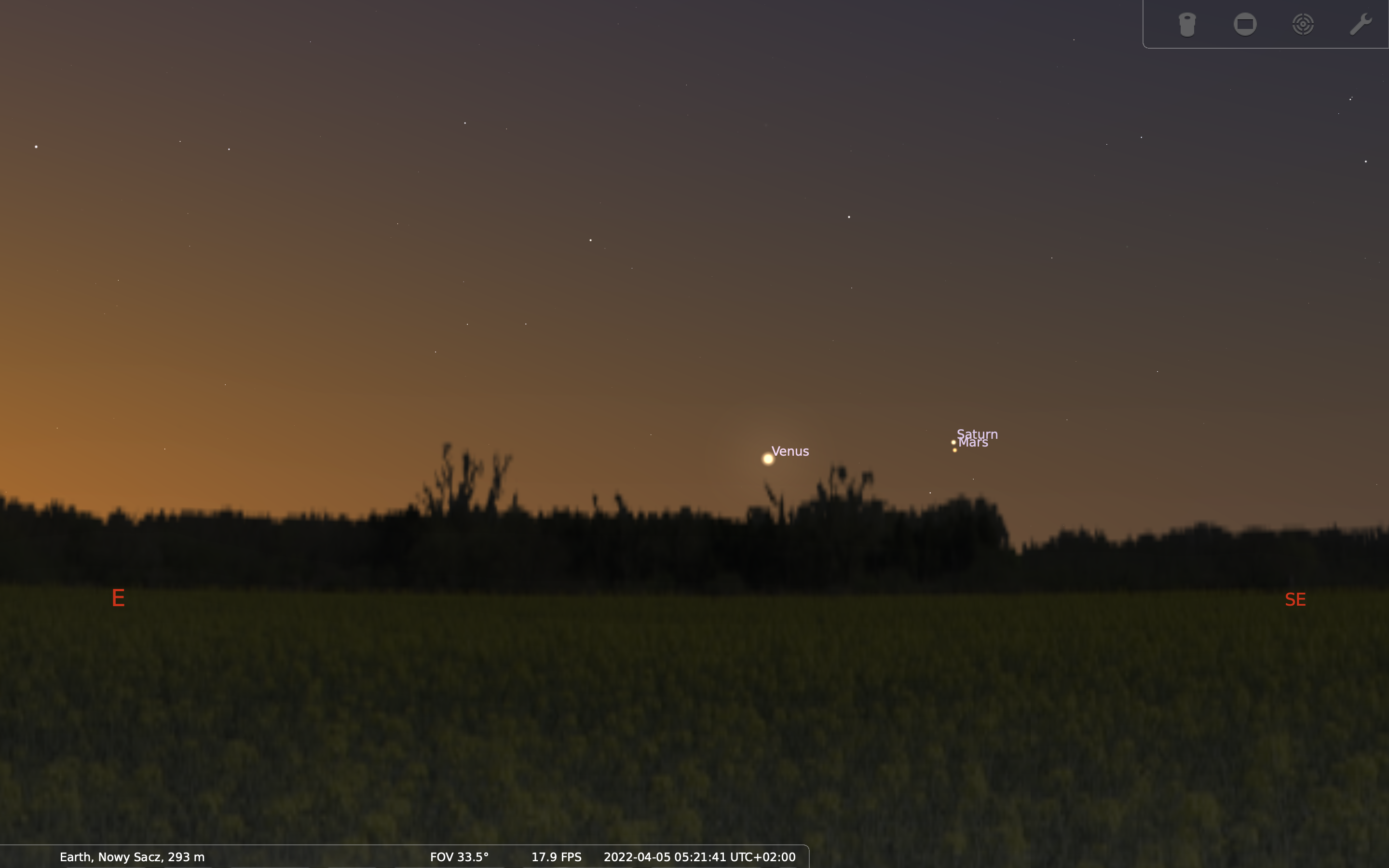 5 kwietnia wczesnym rankiem nisko nad wschodnim horyzontem zaobserwujemy bardzo bliską koniunkcję Marsa z Saturnem, obok których widnieć będzie jasna Wenus. Dla poprawy komfortu obserwacji warto będzie użyć lornetki, która wyraźnie pokaże obie planety, które w miarę jak zbliżać się będzie wschód Słońca, tracić będą na swojej jasności. Warto wybrać się w miejsce, w którym wschodni horyzont jest dobrze widoczny.