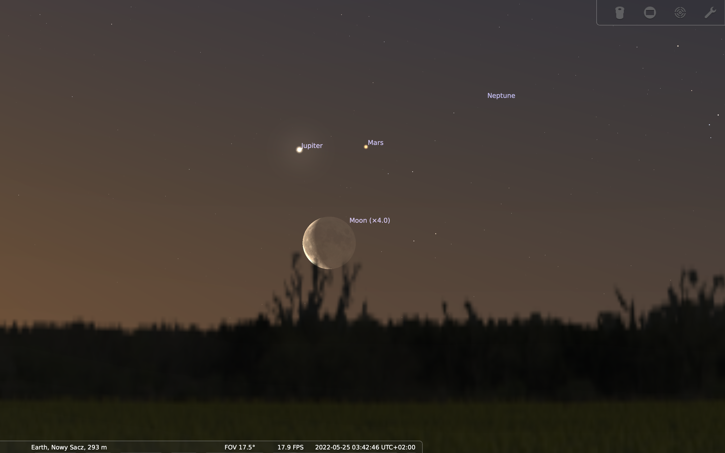 25 maja nad ranem czeka nas kolejne atrakcyjne spotkanie - tym razem w pobliżu Księżyca znajdą się Mars w Jowiszem, które w następnych nocach (a właściwie - porankach) będą coraz bardziej zbliżać się ku sobie - najbardziej 29 i 30 maja (już bez Księżyca). Zjawisku przyglądać się będziemy także nisko nad horyzontem, ale i tak wyżej niż w wyżej wspomnianych przypadkach. Nieopodal znajdzie się również Neptun, którego będzie można próbować dostrzec przez lornetkę.