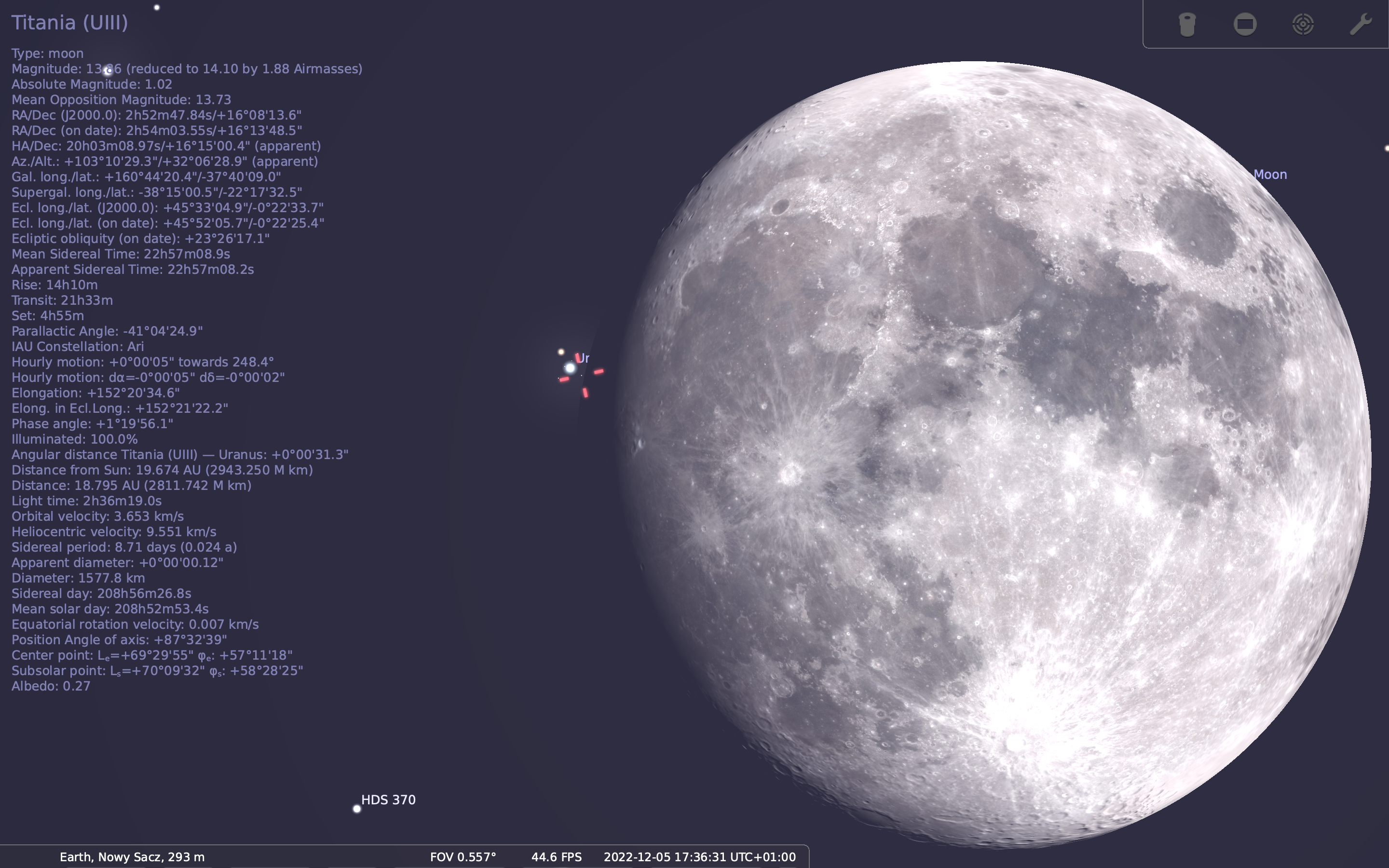 5 grudnia wieczorem dojdzie do drugiego w tym roku zakrycia Urana przez Księżyc. Tym razem zjawisko rozpocznie się wczesną porą (w Łodzi o 17:42) i potrwa 58 minut, jednak obserwację może utrudnić większa niż we wrześniu faza Księżyca (94%, blisko pełni), przez co słabe światło Urana może zaniknąć nawet w lornetkach - dlatego na lepsze warunki obserwacyjne lepiej nastawić się we wrześniu. W grudniu czeka nas inne zakrycie - dużo lepsze.
